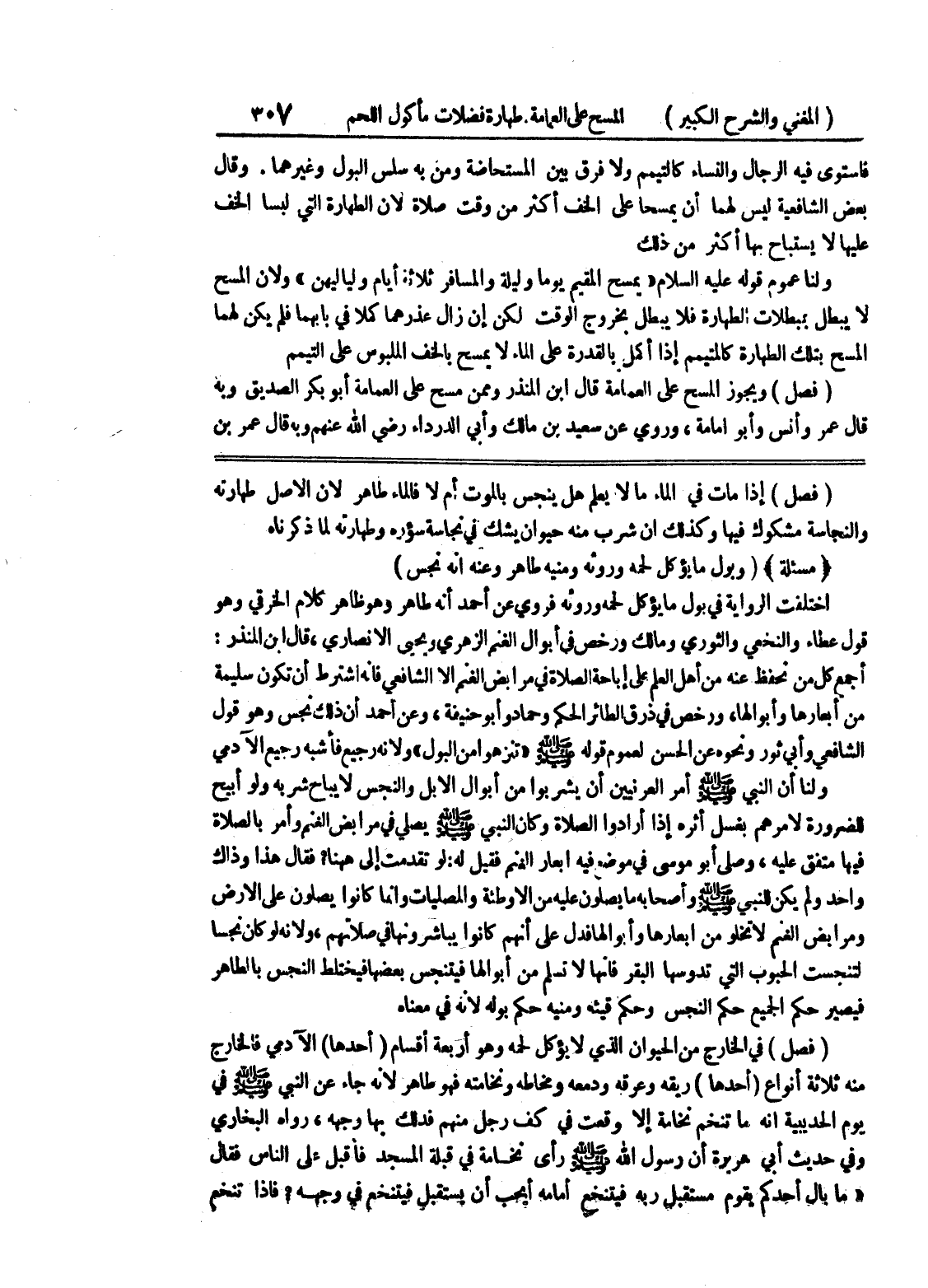 اختلفت الرواية في بول ما يؤكل لحمه وروثه فروي عن أحمد أنه طاهر وهو ظاهر كلام الخرقي وهو قول عطاء والنخعي والثوري ومالك ورخص في أبوال الغنم الزهري ويحيى الأنصاري، قال إبن المنذر: أجمع كل من نحفظ عنه من أهل العلم على إباحة الصلاة في مرابض الغنم إلا الشافعي فإنه اشترط أن تكون سليمة من أبعارها وأبوالها، ورخص في ذرق الطائر الحكم وحماد وأبو حنيفة، وعن أحمد أن ذلك نجس وهو قول الشافعي وأبي ثور ونحوه عن الحسن لعموم قوله صلى الله عليه وسلم " تنزهوا من البول " ولأنه رجيع فأشبه رجيع الآدمي ولنا أن النبي صلى الله عليه وسلم أمر العرنيين أن يشربوا من أبوال الإبل والنجس لا يباح شربه ولو أبيح للضرورة لأمرهم بغسل أثره إذا أرادوا الصلاة وكان النبي صلى الله عليه وسلم يصلي في مرابض الغنم وأمر بالصلاة فيها متفق عليه، وصلى أبو موسى في موضع فيه أبعار الغنم فقيل له: لو تقدم إلى ههنا؟ فقال هذا وذاك واحد ولم يكن للنبي صلى الله عليه وسلم وأصحابه ما يصلون عليه من الأوطئة والمصليات وإنما كانوا يصلون على الأرض ومرابض الغنم لا تخلو من أبعارها وأبوالها فدل على أنهم كانوا يباشرونها في صلاتهم، ولأنه لو كان نجساً لتنجست الحبوب التي تدوسها البقر فإنها لا تسلم من أبوالها فيتنجس بعضها فيختلط النجس بالطاهر فيصير حكم الجميع حكم النجس وحكم قيئه ومنيه حكم بوله لأنه في معناه (فصل) في الخارج من الحيوان الذي لا يؤكل لحمه وهو أربعة اقسام (أحدها) الآدمي فالخارج منه ثلاثة أنواع (أحدها) ريقه وعرقه ودمعه ومخاطه ونخامته فهو طاهر لأنه جاء عن النبي صلى الله عليه وسلم في يوم الحديبية أنه ما تنخم نخامة إلا وقعت في كف رجل منهم فدلك بها وجهه، رواه البخاري وفي حديث أبي هريرة أن رسول الله صلى الله عليه وسلم رأى نخامة في قبلة المسجد فأقبل علي الناس فقال " ما بال أحدكم يقوم مستقبل ربه فيتنخع أمامه أيحب أن يستقبل فيتنخع في وجهه؟ فإذا تنخع