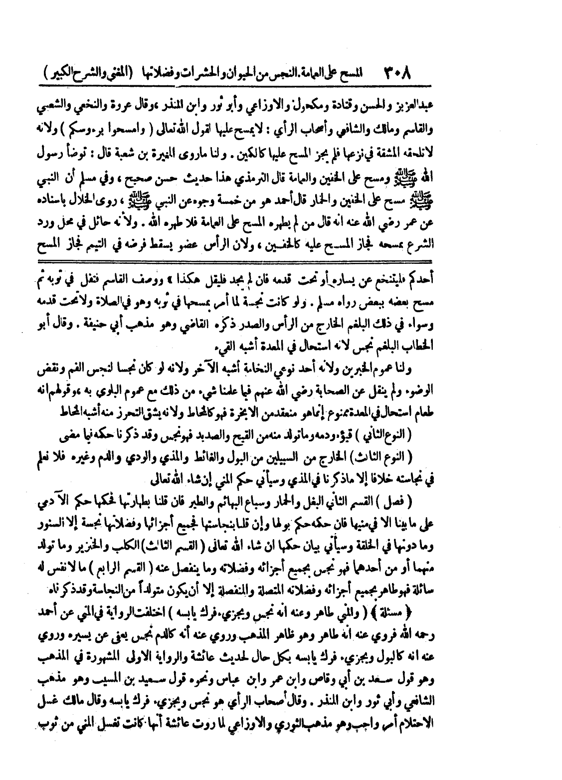 الوضوء ولم ينقل عن الصحابة رضي الله عنهم فيما علمنا شئ من ذلك مع عموم البلوى به، وقولهم إنه طعام إستحال في المعدة ممنوع إنما هو منعقد من الأبخرة فهو كالمخاط ولأنه يشق التحرز منه أشبه المخاط (النوع الثاني) قيؤه ودمه وما تولد منه من القيح والصديد فهو نجس وقد ذكرنا حكمه فيما مضى (النوع الثالث) الخارج من السبيلين من البول والغائط والمذي والودي والدم وغيره فلا نعلم في نجاسته خلافاً إلا ما ذكرنا في المذي وسيأتي حكم المني إن شاء الله تعالى (فصل) القسم الثاني البغل والحمار وسباع البهائم والطير فإن قلنا بطهارتها فحكمها حكم الآدمي على ما بينا إلا في منيها فإن حكمه حكم بولها وإن قلنا بنجاستها فجميع أجزائها وفضلاتها نجسه إلا السنور وما دونها في الخلقة وسيأتي بيان حكمها إن شاء الله تعالى (القسم الثالث) الكلب والخنزير وما تولد منهما أو من أحدهما فهو نجس بجميع أجزائه وفضلاته وما ينفصل عنه (القسم الرابع) ما لان نفس له سائلة فهو طاهر بجميع أجزائه وفضلاته المتصلة والمنفصلة إلا أن يكون متولداً من النجاسة وقد ذكرناه (مسألة) (والمني طاهر وعنه أنه نجس ويجزئ فرك يابسه) اختلفت الرواية في المني عن أحمد رحمه الله فروي عنه أنه طاهر وهو ظاهر المذهب وروي عنه أنه كالدم نجس يعفى عن يسيره وروي عنه أنه كالبول ويجزئ فرك يابسه بكل حال لحديث عائشة والرواية الأولى المشهورة في المذهب وهو قول سعد بن أبي وقاص وابن عمر وابن عباس ونحوه قول سعيد بن المسيب وهو مذهب الشافعي وأبي ثور وابن المنذر.