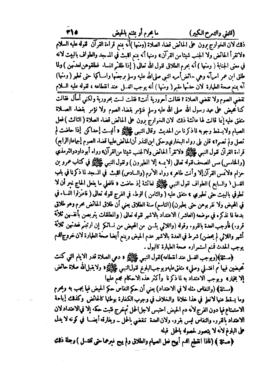 (مسألة) (ويوجب الغسل عند انقطاعه) لقول النبي صلى الله عليه وسلم " دعي الصلاة قدر الأيام التي كنت تحيضين فيها ثم اغتسلي وصلي " متفق عليه ويوجب البلوغ لقول النبي صلى الله عليه وسلم " ولا يقبل الله صلاة حائض إلا بخمار " ويوجب الاعتداد به لما ذكرنا وأكثر هذه الاحكام مجمع عليها (مسألة) (والنفاس مثله لا في الاعتداد) يعني أن حكم النفاس حكم الحيض فيما يجب به ويحرم وما يسقط عنها لا نعلم في هذا خلافا والخلاف في وجوب الكفارة بوطئها كالحائض وكذلك إباحة الاستمتاع فيما دون الفرج لأنه دم الحيض احتبس لأجل الحمل ثم خرج فثبت حكمه إلا في الاعتداد لأن الاعتداد بالقروء والنفاس ليس بقروء ولأن العدة تنقضي بالحمل - ويفارقه أيضاً في كونه لا يدل على البلوغ لأنه لا يتصور لحصوله بالحمل قبله (مسألة) (فإذا إنقطع الدم أبيح فعل الصيام والطلاق ولم يبح غيرهما حتى تغتسل) وجملة ذلك