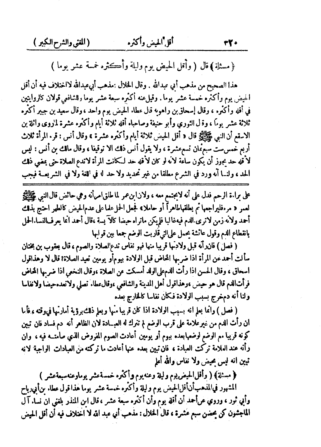 على براءة الرحم فدل على أنه لا يجتمع معه، ولأن ابن عمر لما طلق امرأته وهي حائض قال النبي صلى الله عليه وسلم لعمر " مره فليراجعها ثم يطلقها طاهراً أو حاملاً " فجعل الحمل علماً على عدم الحيض كالطهر إحتج بذلك أحمد ولأنه زمن لا ترى الدم فيه غالباً فلم يكن ما تراه حيضاً كالآيسة، قال أحمد إنما يعرف النساء الحمل بإنقطاع الدم وقول عائشة يحمل على التي قاربت الوضع جمعاً بين قوليها (فصل) فإن رأته قبل ولادتها قريباً منها فهو نفاس تدع الصلاة والصوم، قال يعقوب بن بختان سألت أحمد عن المرأة إذا ضربها المخاض قبل الولادة بيوم أو يومين تعيد الصلاة؟ قال لا وهذا قول إسحاق، وقال الحسن إذا رأت الدم على الولد أمسكت عن الصلاة، وقال النخعي إذا ضربها المخاض فرأت الدم قال هو حيض، وهذا قول أهل المدينة والشافعي، وقال عطاء تصلي ولا تعده حيضاً ولا نفاساً ولنا أنه دم خرج بسبب الولادة فكان نفاساً كالخارج بعده (فصل) وإنما يعلم أنه بسبب الولادة إذا كان قريبا منها ويعلم ذلك برؤية أمارتها في وقته، فأما أن رأت الدم من غير علامة على قرب الوضع لم تترك له العبادة لأن الظاهر أنه دم فساد فإن تبين كونه قريباً مع الوضع لوضعها بعده بيوم أو يومين أعادت الصوم المفروض الذي صامته فيه، وإن رأته عند العلامة تركت العبادة، فإن تبين بعده عنها أعادت ما تركته من العبادات الواجبة لأنه تبين أنه ليس بحيض ولا نفاس والله أعلم (مسألة) (وأقل الحيض يوم وليلة وعنه يوم وأكثره خمسة عشر يوماً وعنه سبعة عشر) المشهور في المذهب أن أقل الحيض يوم وليلة وأكثره خمسة عشر يوماً هذا قول عطاء بن أبي رباح