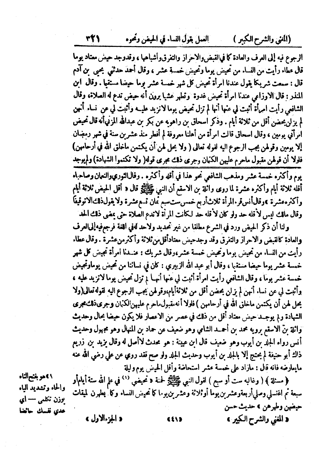 وقال الثوري والنعمان وصاحباه أقله ثلاثة أيام وأكثره عشرة لما روى واثلة بن الاسقع أن النبي صلى الله عليه وسلم قال " أقل الحيض ثلاثة أيام وأكثره عشرة " وقال أنس قرء المرأة ثلاث أربع خمس ست سبع ثمان تسع عشرة ولا يقول ذلك الا توقيفا وقال مالك ليس لأقله حد ولو كان لأقله حد لكانت المراة لا تدع الصلاة حتى يمضي ذلك الحد ولنا إن ذكر الحيض ورد في الشرع مطلقاً من غير تحديد ولا حد له في اللغة فرجع فيه إلى العرف والعادة كالقبض والإحراز والتفرق وقد وجد حيض معتاد أقل من ثلاثة وأكثر من عشرة.