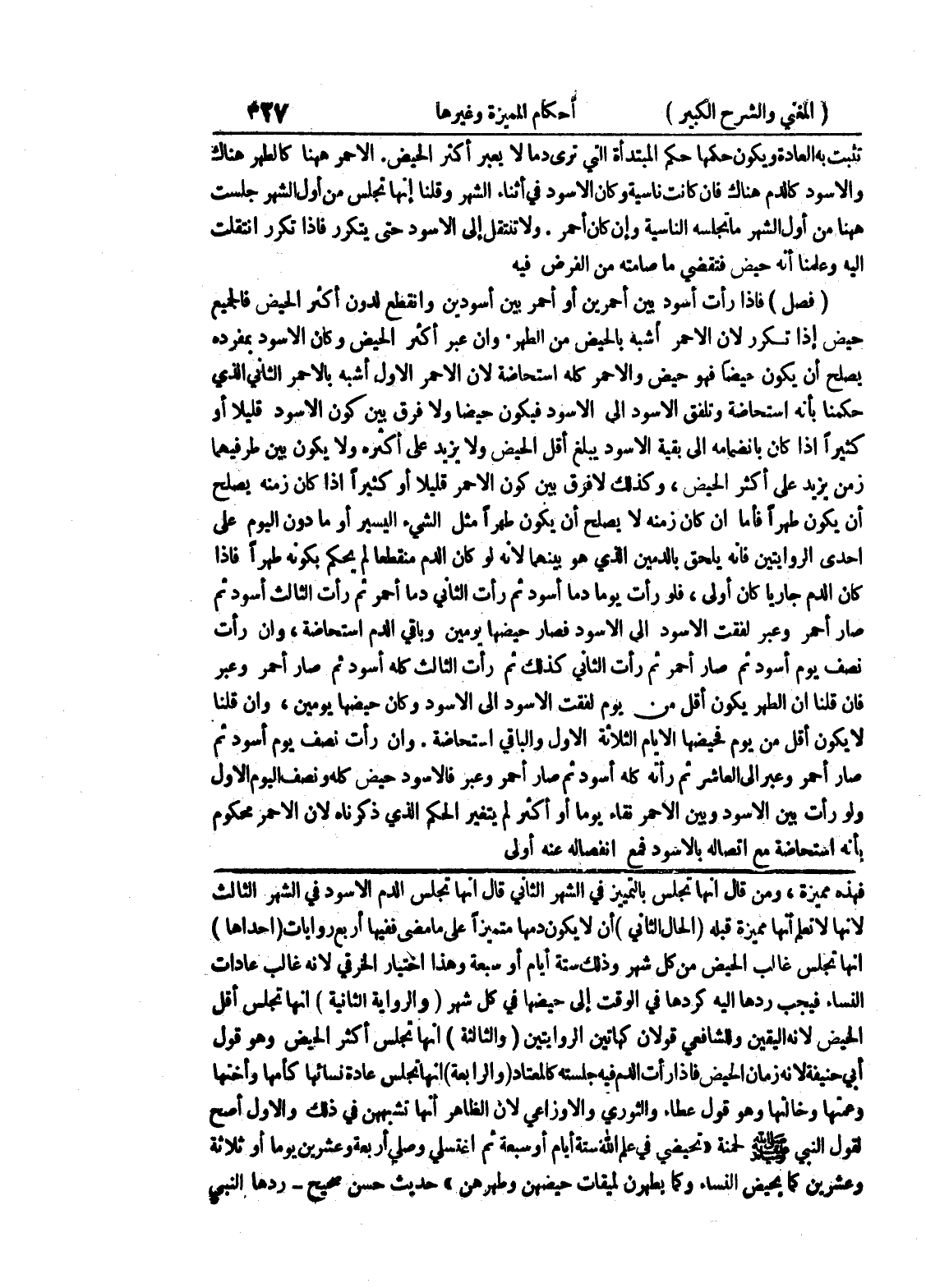 فهذه مميزة، ومن قال إنها تجلس بالتمييز في الشهر الثاني قال إنها تجلس الدم الأسود في الشهر الثالث لأنها لا تعلم أنها مميزة قبله (الحال الثاني) أن لا يكون دمها متميزاً على ما مضى ففيها أربع روايات (إحداها) أنها تجلس غالب الحيض من كل شهر وذلك ستة أيام أو سبعة وهذا اختيار الخرقي لأنه غالب عادات النساء فيجب ردها إليه كردها في الوقت إلى حيضها في كل شهر (والرواية الثانية) أنها تجلس أقل الحيض لأنه اليقين وللشافعي قولان كهاتين الروايتين (والثالثة) أنها تجلس أكثر الحيض وهو قول أبي حنيفة لأنه زمان الحيض فإذا رأت الدم فيه جلسته كالمعتاد (والرابعة) أنها تجلس عادة نسائها كأمها وأختها وعمتها وخالتها وهو قول عطاء والثوري والاوزاعي لأن الظاهر أنها تشبههن في ذلك والأول أصح لقول النبي صلى الله عليه وسلم لحمنة " تحيضي في علم الله ستة أيام أو سبعة ثم اغتسلي وصلي أربعة وعشرين يوماً أو ثلاثة وعشرين كما يحيض النساء وكما يطهرن لميقات حيضهن وطهرهن " حديث حسن صحيح - ردها النبي