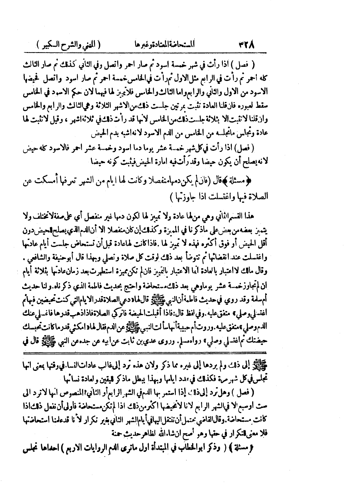 صلى الله عليه وسلم الى ذلك ولم يردها إلى غيره مما ذكر ولأن هذه ترد إلى غالب عادات النساء في وقتها بمعنى أنها تجلس في كل شهر مرة فكذلك في عدد أيامها وبهذا يبطل ما ذكر لليقين ولعادة نسائها (فصل) وهل ترد إلى ذلك إذا استمر بها الدم في الشهر الرابع أو الثاني؟ المنصوص أنها لا ترد الى ست أو سبع إلا في الشهر الرابع لأنا لا نحيضها أكثر من ذلك إذا لم تكن مستحاضة فأولى أن نفعل ذلك إذا كانت مستحاضة.