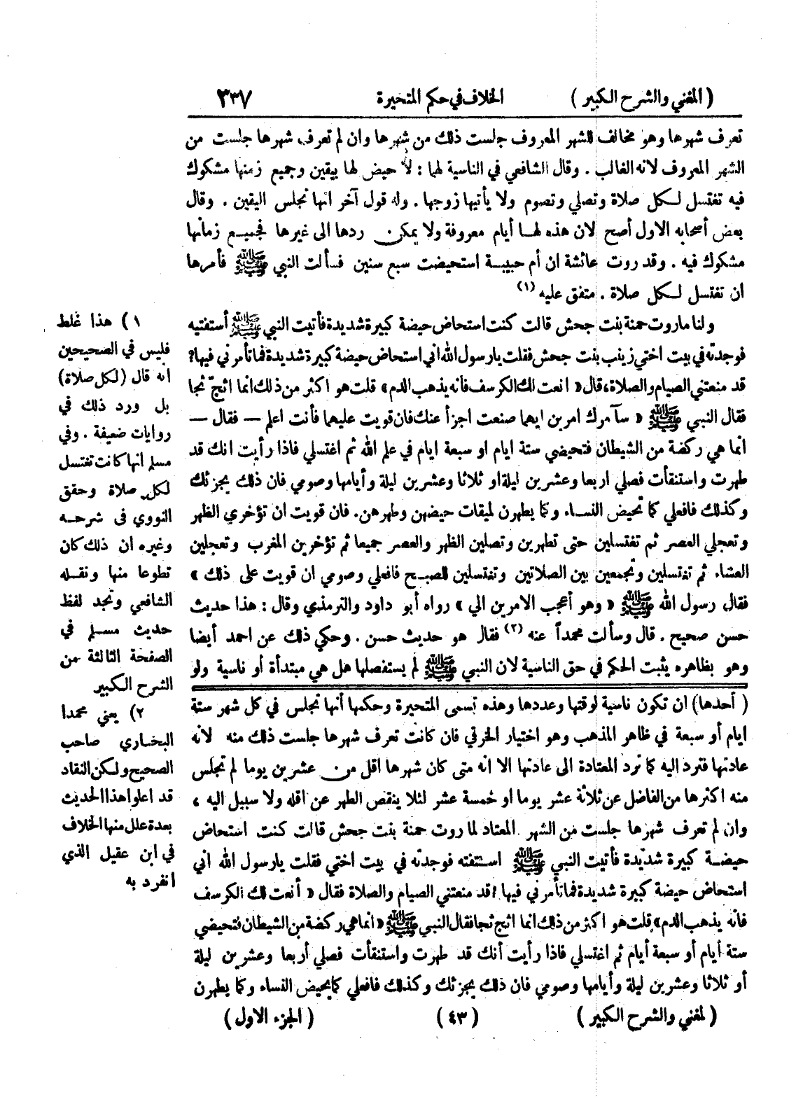 (أحدها) أن تكون ناسية لوقتها وعددها وهذه تسمى المتحيرة وحكمها أنها تجلس في كل شهر ستة أيام أو سبعة في ظاهر المذهب وهو اختيار الخرقي فإن كانت تعرف شهرها جلست ذلك منه لأنه عادتها فترد إليه كما ترد المعتادة إلى عادتها إلا أنه متى كان شهرها أقل من عشرين يوماً لم تجلس منه أكثرها من الفاضل عن ثلاثة عشر يوماً أو خمسة عشر لئلا ينقص الطهر عن أقله ولا سبيل إليه، وإن لم تعرف شهرها جلست من الشهر المعتاد لما روت حمنة بنت جحش قالت كنت أستحاض حيضة كبيرة شديدة فأتيت النبي صلى الله عليه وسلم أستفته فوجدته في بيت أختي فقلت يا رسول الله إني أستحاض حيضة كبيرة شديدة فما تأمرني فيها؟ قد منعتني الصيام والصلاة فقال " أنعت لك الكرسف فإنه يذهب الدم " قلت هو أكثر من ذلك إنما أثج ثجاً فقال النبي صلى الله عليه وسلم " إنما هي ركضة من الشيطان فتحيضي ستة أيام أو سبعة أيام ثم إغتسلي فإذا رأيت أنك قد طهرت واستنقأت فصلي أربعاً وعشرين ليلة أو ثلاثاً وعشرين ليلة وأيامها وصومي فإن ذلك يجزئك وكذلك فافعلي كما يحيض النساء وكما يطهرن