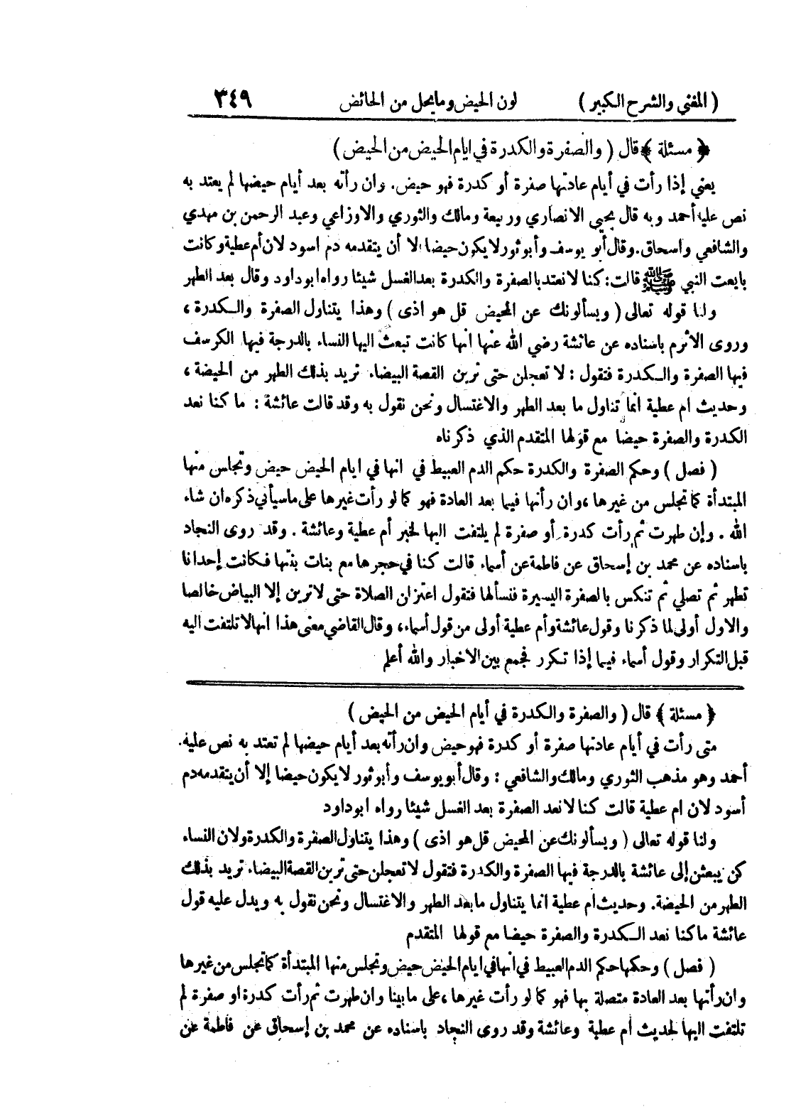 (مسألة) قال (والصفرة والكدرة في أيام الحيض من الحيض) متى رأت في أيام عادتها صفرة أو كدرة فهو حيض وإن رأته بعد أيام حيضها لم تعتد به نص عليه أحمد وهو مذهب الثوري ومالك والشافعي: وقال أبو يوسف وأبو ثور لا يكون حيضاً إلا أن يتقدمه دم