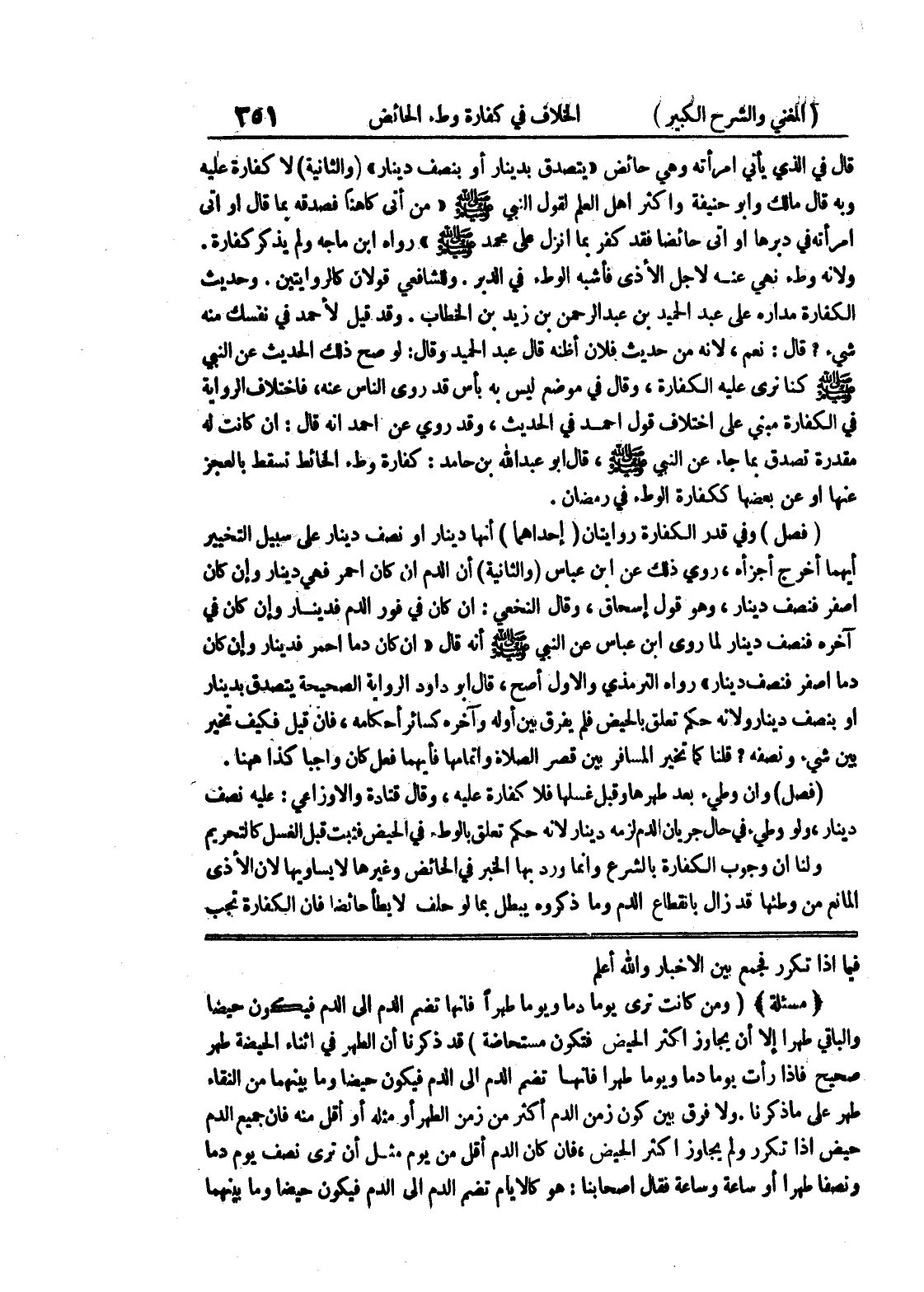 فيما إذا تكرر فجمع بين الأخبار والله أعلم (مسألة) (ومن كانت ترى يوماً دماً ويوماً طهراً فإنها تضم الدم إلى الدم فيكون حيضاً والباقي طهراً إلا أن يجاوز أكثر الحيض فتكون مستحاضة) قد ذكرنا أن الطهر في أثناء الحيضة طهر صحيح فإذا رأت يوماً دماً ويوماً طهراً فإنها تضم الدم إلى الدم فيكون حيضاً وما بينهما من النقاء طهر على ما ذكرنا.