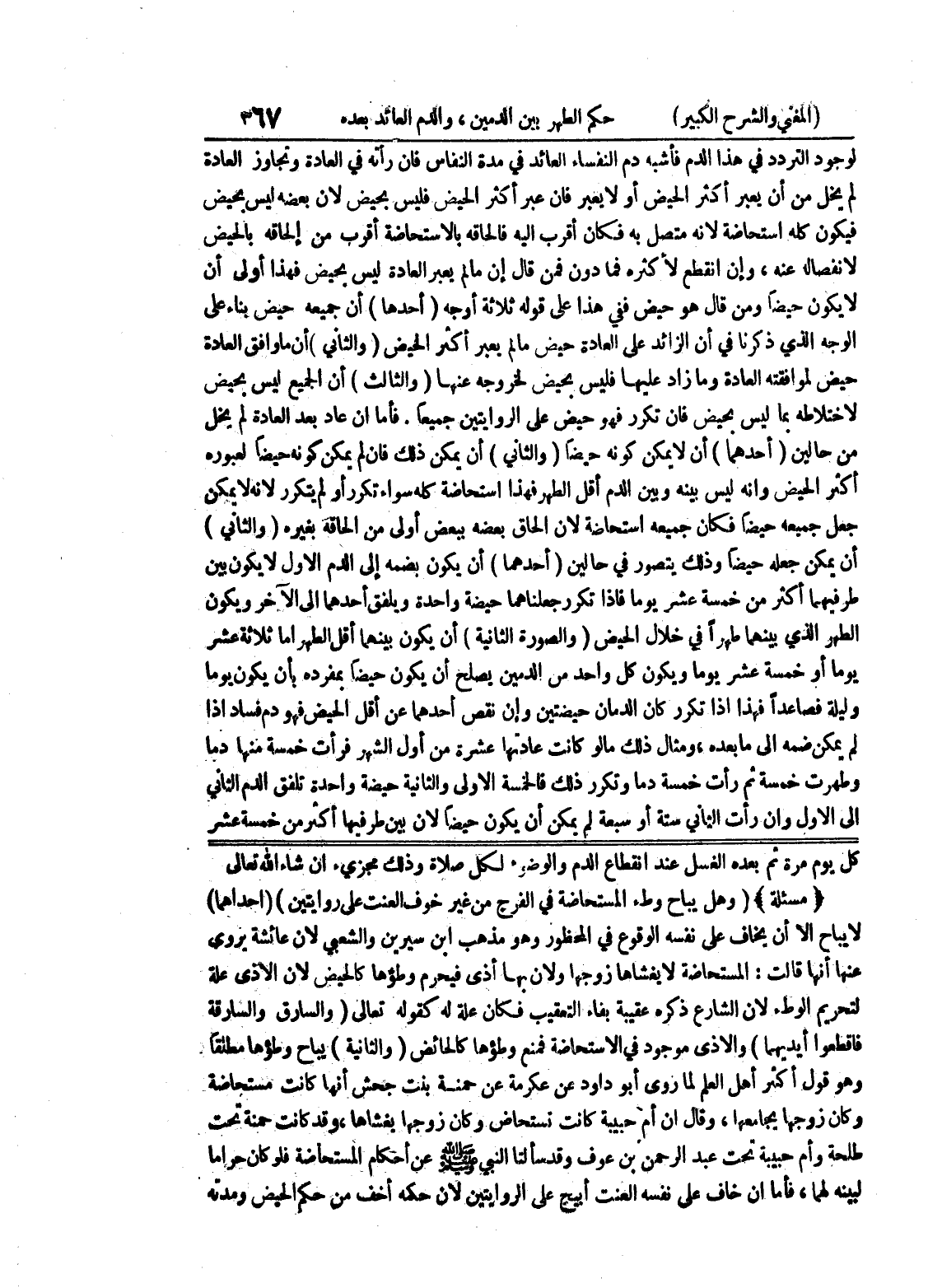 لا يباح إلا أن يخاف على نفسه الوقوع في المحظور وهو مذهب ابن سيرين والشعبي لأن عائشة يروي عنها أنها قالت: المستحاضة لا يغشاها زوجها ولأن بها أذى فيحرم وطؤها كالحيض لأن الأذى علة لتحريم الوطئ لأن الشارع ذكره عقيبة بفاء التعقيب فكان علة له كقوله تعالى (والسارق والسارقة فاقطعوا أيديهما) والأذى موجود في الإستحاضة فمنع وطؤها كالحائض (والثانية) يباح وطؤها مطلقاً وهو قول أكثر أهل العلم لما روى أبو داود عن عكرمة عن حمنة بنت جحش أنها كانت مستحاضة وكان زوجها يجامها، وقال أن أم حبيبة كانت تستحاض وكان زوجها يغشاها، وقد كانت حمنة تحت طلحة وأم حبيبة تحت عبد الرحمن بن عوف وقد سألتا النبي صلى الله عليه وسلم عن أحكام المستحاضة فلو كان حراماً لبينه لهما، فأما إن خاف على نفسه العنت أبيج على الروايتين لأن حكمه أخف من حكم الحيض ومدته