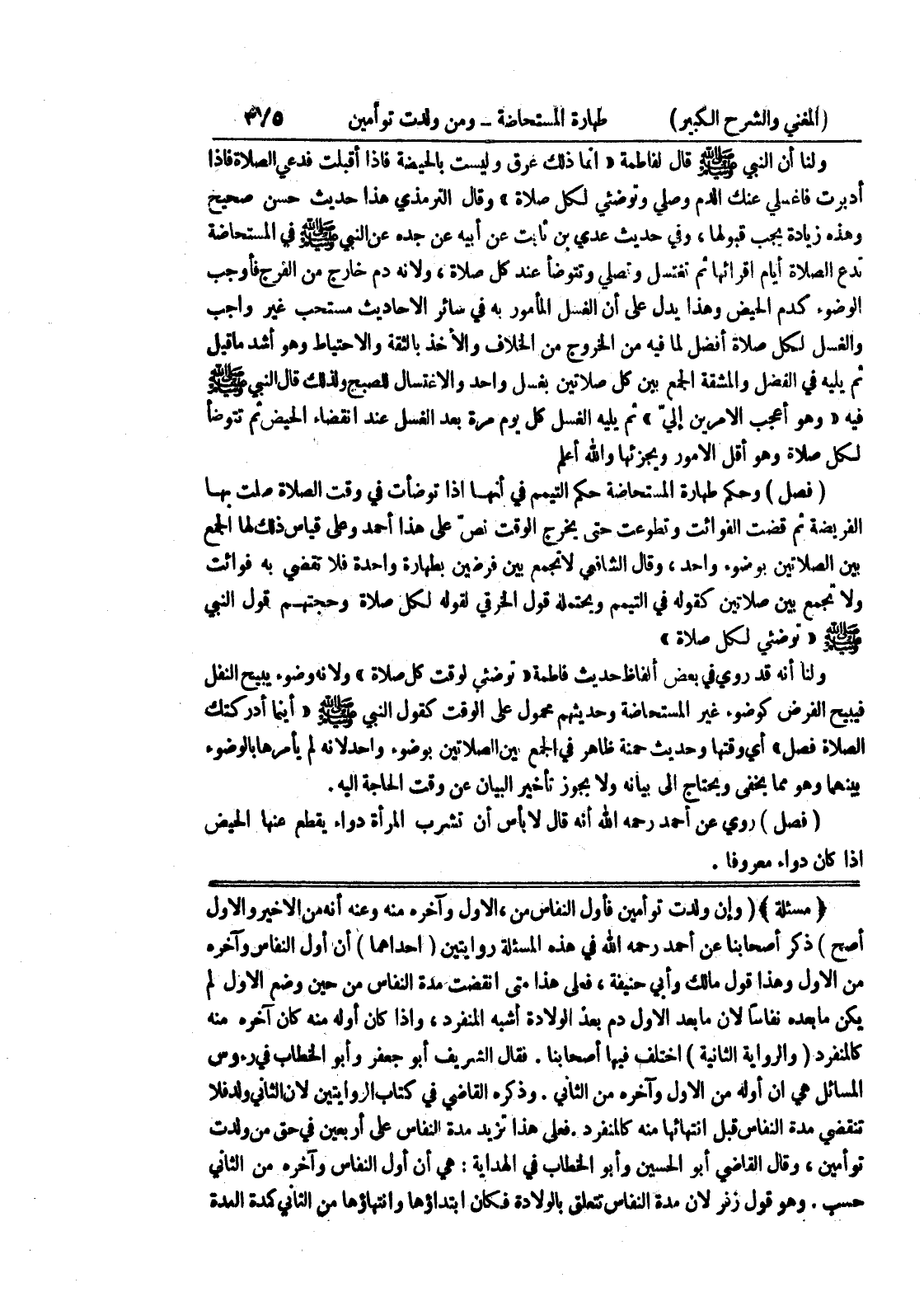 (مسألة) (وإن ولدت توأمين فأول النفاس من، الأول وآخره منه وعنه أنه من الأخير والأول أصح) ذكر أصحابنا عن أحمد رحمه الله في هذه المسألة روايتين (إحداهما) إن أول النفاس وآخره من الأول وهذا قول مالك وأبي حنيفة، فعلى هذا متى انقضت مدة النفاس من حين وضع الأول لم يكن ما بعده نفاساً لأن ما بعد الأول دم بعد الولادة أشبه المنفرد، وإذا كان أوله منه كان آخره منه كالمنفرد (والرواية الثانية) اختلف فيها أصحابنا.