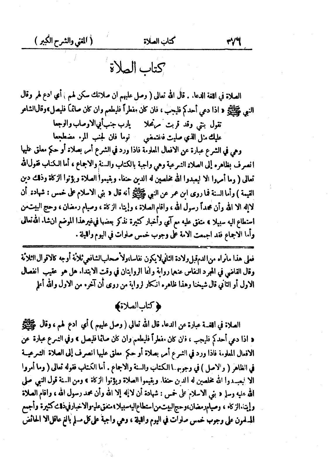 فعلى هذا ما تراه من الدم قبل ولادة الثاني لا يكون نفاساً، ولأصحاب الشافعي ثلاثة أوجه كالأقوال الثلاثة وقال القاضي في المجرد النفاس عنهما رواية وإنما الروايتان في وقت الإبتداء هل هو عقيب إنفصال الأول أو الثاني قال شيخنا وهذا ظاهره إنكار لرواية من روى أن آخره من الأول والله أعلم (كتاب الصلاة) الصلاة في اللغة عبارة عن الدعاء قال الله تعالى (وصل عليهم) أي أدع لهم، وقال صلى الله عليه وسلم " إذا دعي أحدكم فليجب، فإن كان مفطراً فليطعم وإن كان صائماً فليصل " وفي الشرع عبارة عن