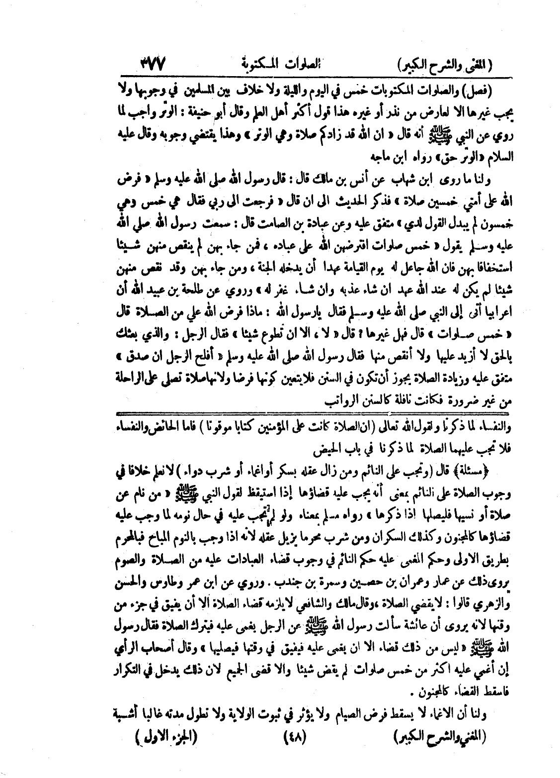 والنفساء لما ذكرنا ولقول الله تعالى (أن الصلاة كانت على المؤمنين كتابا موقوتا) فأما الحائض والنفساء فلا تجب عليهما الصلاة لما ذكرنا في باب الحيض (مسألة) قال (وتجب على النائم ومن زال عقله بسكر أو إغماء أو شرب دواء) لا نعلم خلافاً في وجوب الصلاة على النائم بمعنى أنه يجب عليه قضاؤها إذا استيقظ لقول النبي صلى الله عليه وسلم " من نام عن صلاة أو نسيها فليصلها إذا ذكرها " رواه مسلم بمعناه ولو لم تجب عليه في حال نومه لما وجب عليه قضاؤها كالمجنون وكذلك السكران ومن شرب محرماً يزيل عقله لأنه إذا وجب بالنوم المباح فبالمحرم بطريق الأولى وحكم المغمى عليه حكم النائم في وجوب قضاء العبادات عليه من الصلاة والصوم يروي ذلك عن عمار وعمران بن حصين وسمرة بن جندب.