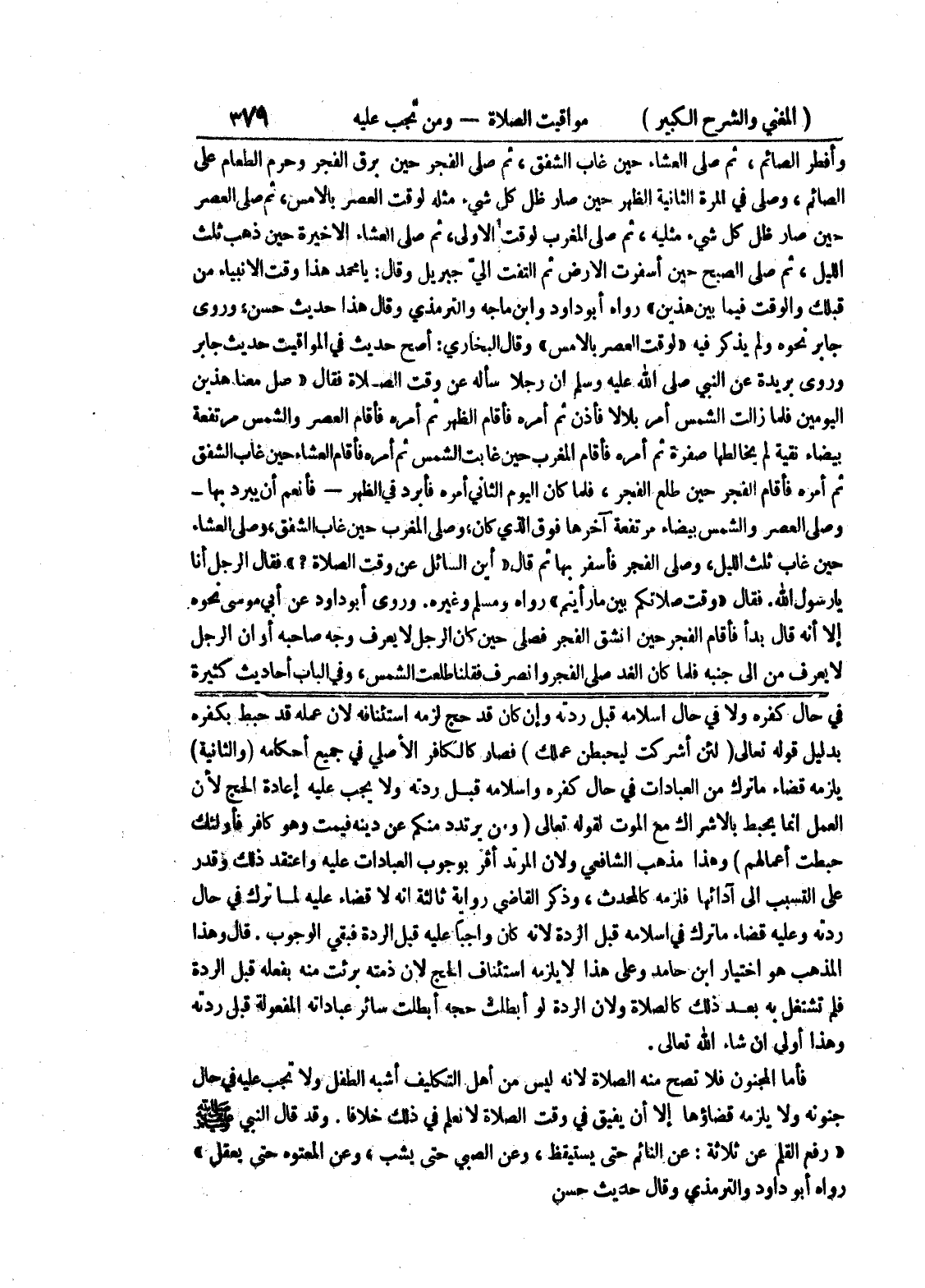 في حال كفره ولا في حال إسلامه قبل ردته وإن كان قد حج لزمه استئنافه لأن عمله قد حبط بكفره بدليل قوله تعالى (لئن أشركت ليحبطن عملك) فصار كالكافر الأصلي في جميع أحكامه (والثانية) يلزمه قضاء ما ترك من العبادات في حال كفره وإسلامه قبل ردته ولا يجب عليه إعادة الحج لأن العمل إنما يحبط بالإشراك مع الموت لقوله تعالى (ومن يرتدد منكم عن دينه فيمت وهو كافر فأولئك حبطت أعمالهم) وهذا مذهب الشافعي ولأن المرتد أقر بوجوب العبادات عليه واعتقد ذلك وقدر على التسبب إلى آدائها فلزمه كالمحدث، وذكر القاضي رواية ثالثة أنه لا قضاء عليه لما ترك في حال ردته وعليه قضاء ما ترك في إسلامه قبل الردة لأنه كان واجباً عليه قبل الردة فبقي الوجوب.