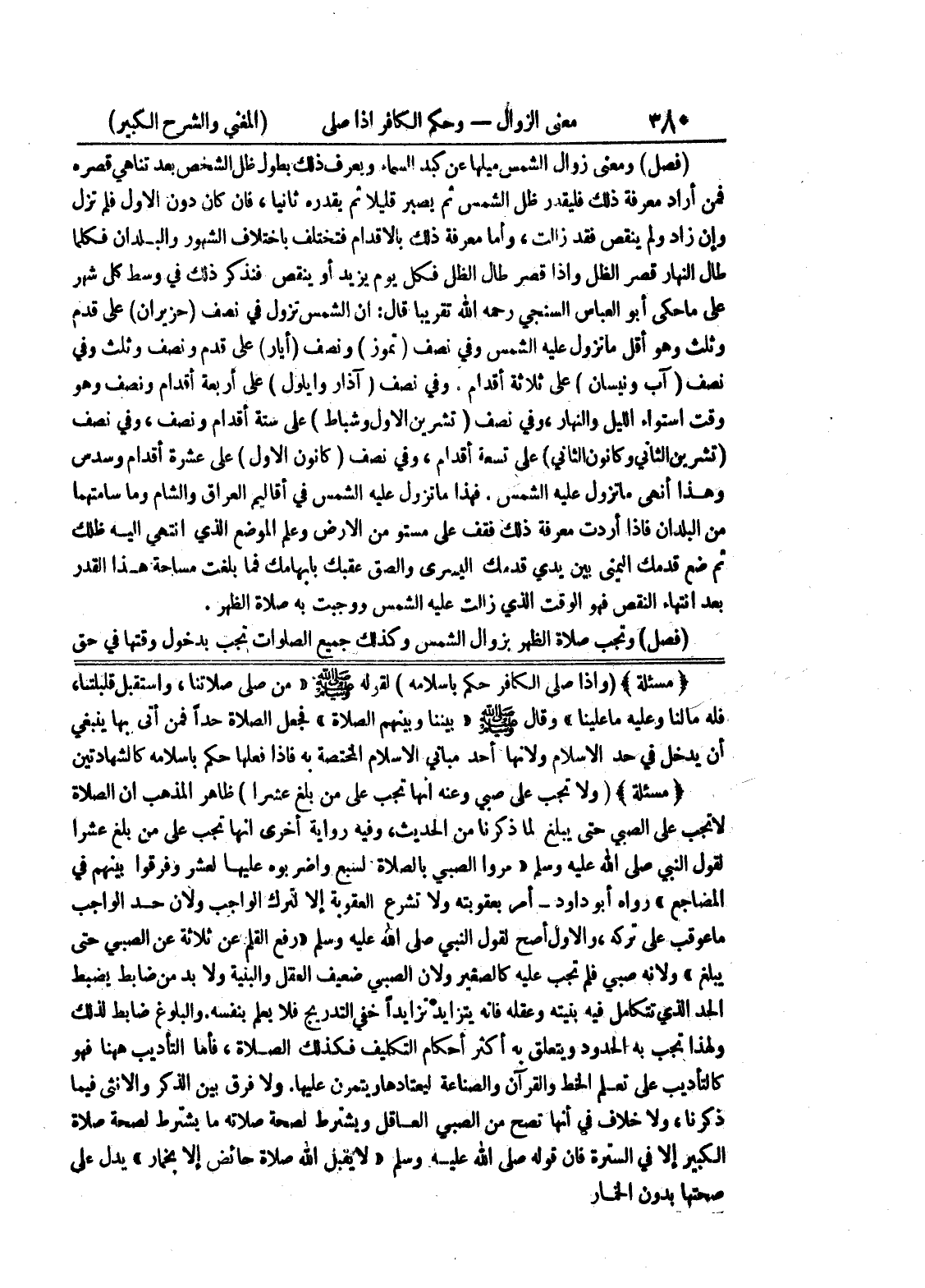 (مسألة) (وإذا صلى الكافر حكم بإسلامه) لقوله صلى الله عليه وسلم " من صلى صلاتنا، واستقبل قبلتنا، فله مالنا وعليه ما علينا " وقال صلى الله عليه وسلم " بيننا وبينهم الصلاة " فجعل الصلاة حدا فمن أتى بها ينبغي أن يدخل في حد الإسلام ولأنها أحد مباني الإسلام المختصة به فإذا فعلها حكم بإسلامه كالشهادتين (مسألة) (ولا تجب على صبي وعنه أنها تجب على من بلغ عشراً) ظاهر المذهب أن الصلاة لا تجب على الصبي حتى يبلغ لما ذكرنا من الحديث، وفيه رواية أخرى أنها تجب على من بلغ عشراً لقول النبي صلى الله عليه وسلم " مروا الصبي بالصلاة لسبع واضربوه عليها لعشر وفرقوا بينهم في المضاجع " رواه أبو داود - أمر بعقوبته ولا تشرع العقوبة إلا لترك الواجب ولأن حد الواجب ما عوقب على تركه، والأول أصح لقول النبي صلى الله عليه وسلم " رفع القلم عن ثلاثة عن الصبي حتى يبلغ " ولأنه صبي فلم تجب عليه كالصغير ولأن الصبي ضعيف العقل والبنية ولا بد من ضابط يضبط الحد الذي تتكامل فيه بنيته وعقله فإنه يتزايد تزايداً خفي التدريج فلا يعلم بنفسه.