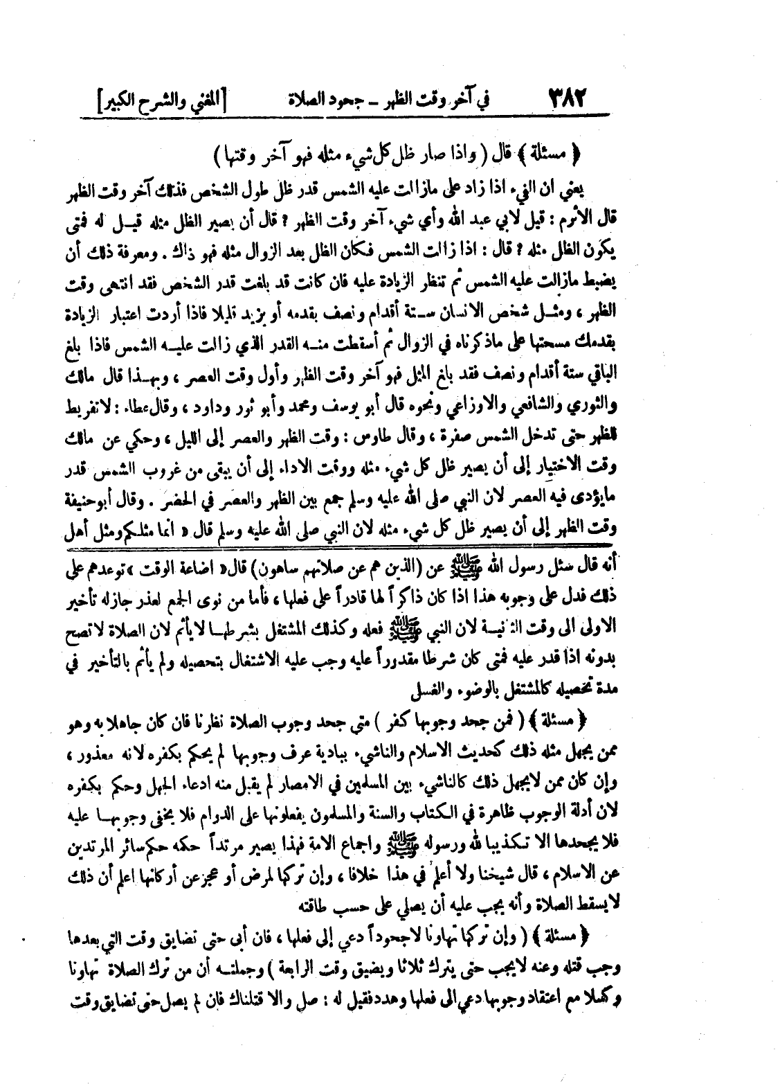 (مسألة) (فمن جحد وجوبها كفر) متى جحد وجوب الصلاة نظرنا فإن كان جاهلاً به وهو ممن يجهل مثله ذلك كحديث الإسلام والناشئ ببادية عرف وجوبها لم يحكم بكفره لأنه معذور، وإن كان ممن لا يجهل ذلك كالناشئ بين المسلمين في الأمصار لم يقبل منه إدعاء الجهل وحكم بكفره لأن أدلة الوجوب ظاهرة في الكتاب والسنة والمسلمون يفعلونها على الدوام فلا يخفى وجوبها عليه فلا يجحدها إلا تكذيباً لله ورسوله صلى الله عليه وسلم وإجماع الأمة فهذا يصير مرتداً حكمه حكم سائر المرتدين عن الإسلام، قال شيخنا ولا أعلم في هذا خلافا، وإن تركها لمرض أو عجز عن أركانها أعلم أن ذلك لا يسقط الصلاة وإنه يجب عليه أن يصلي على حسب طاقته (مسألة) (وإن تركها تهاوناً لا جحوداً دعي إلى فعلها، فإن أبى حتى تضايق وقت التي بعدها وجب قتله وعنه لا يجب حتى يترك ثلاثاً ويضيق وقت الرابعة) وجملته أن من ترك الصلاة تهاوناً وكسلا مع اعتقاد وجوبها دعي إلى فعلها وهدد فقيل له: صل وإلا قتلناك فإن لم يصل حتى تضايق وقت