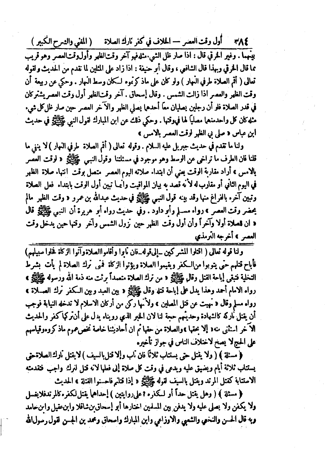 ولنا قوله تعالى (اقتلوا المشركين - إلى قوله - فإن تابوا وأقاموا الصلاة وآتوا الزكاة فخلوا سبيلهم) فأباح قتلهم حتى يتوبوا من الكفر ويقيموا الصلاة ويؤتوا الزكاة فمتى ترك الصلاة لم يأت بشرط التخلية فتبقى إباحة القتل وقال صلى الله عليه وسلم " من ترك الصلاة متعمداً برئت منه ذمة الله ورسوله صلى الله عليه وسلم " رواه الإمام أحمد وهذا يدل على إباحة قتله وقال صلى الله عليه وسلم " بين العبد وبين الكفر ترك الصلاة " رواه مسلم وقال " نهيت عن قتل المصلين " ولأنها ركن من أركان الإسلام لا تدخله النيابة فوجب أن يقتل تاركه كالشهادة وحديثهم حجة لنا لأن الخبر الذي رويناه يدل على أن تركها كفر والحديث الآخر إستثنى منه " إلا بحقها " والصلاة من حقها ثم أن أحاديثنا خاصة تخص عموم ما ذكروه وقياسهم على الحج لا يصح لإختلاف الناس في جواز تأخيره (مسألة) (ولا يقتل حتى يستتاب ثلاثاً فإن تاب وإلا قتل بالسيف) لا يقتل تارك الصلاة حتى يستتا ثلاثة أيام ويضيق عليه ويدعى في وقت كل صلاة إلى فعلها لأنه قتل لترك واجب فتقدمته الاستتابة كقتل المرتد ويقتل بالسيف لقوله صلى الله عليه وسلم " إذا قتلتم فأحسنوا القتلة " الحديث (مسألة) (وهل يقتل حداً أو لكفره؟ على روايتين) إحداهما يقتل لكفره كالمرتد فلا يغسل ولا يكفن ولا يصلى عليه ولا يدفن بين المسلمين اختارها أبو إسحاق بن شاقلا وابن عقيل وابن حامد وبه قال الحسن والنخعي والشعبي والاوزاعي وابن المبارك واسحاق ومحمد بن الحسن لقول رسول الله