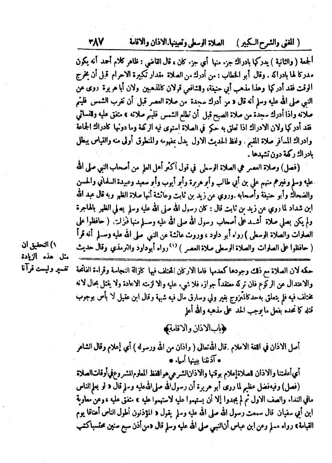 حكمه لأن الصلاة مع ذلك وجودها كعدمها فإما الأركان المختلف فيها كإزالة النجاسة وقراءة الفاتحة والإعتدال عن الركوع فإن تركه معتقداً جوازه فلا شئ عليه وإلا لزمته الإعادة ولا يقتل بحال لأنه مختلف فيه فلم يتعلق به حد كالمتزوج بغير ولي وسارق مال فيه شبهة وقال ابن عقيل لا بأس بوجوب قتله كما نحده بفعل ما يوجب الحد على مذهبه والله أعلم (باب الأذان والإقامة) أصل الأذان في اللغة الإعلام.