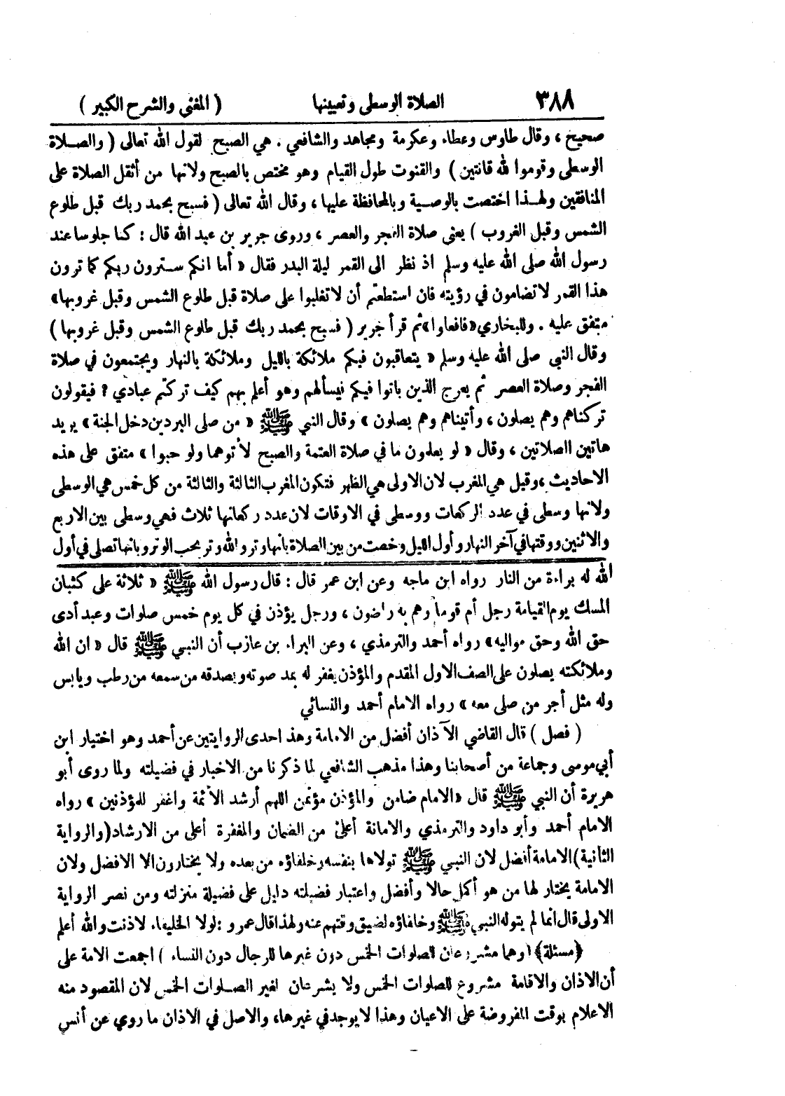 حق الله وحق مواليه " رواه أحمد والترمذي، وعن البراء بن عازب أن النبي صلى الله عليه وسلم قال " إن الله وملائكته يصلون على الصف الأول المقدم والمؤذن يغفر له بمد صوته ويصدقه من سمعه من رطب ويابس وله مثل أجر من صلى معه " رواه الإمام أحمد والنسائي (فصل) قال القاضي الآذان أفضل من الامامة وهذاحدى الروايتين عن أحمد وهو اختيار ابن أبي موسى وجماعة من أصحابنا وهذا مذهب الشافعي لما ذكرنا من الأخبار في فضيلته ولما روى أبو هريرة أن النبي صلى الله عليه وسلم قال " الإمام ضامن والمؤذن مؤتمن اللهم أرشد الأئمة وأغفر للمؤذنين " رواه الإمام أحمد وأبو داود والترمذي والأمانة أعلى من الضمان والمغفرة أعلى من الإرشاد (والرواية الثانية) الإمامة أفضل لأن النبي صلى الله عليه وسلم تولاها بنفسه وخلفاؤه من بعده ولا يختارون إلا الأفضل ولان الامامة يختار لها من هو أكمل حالاً وأفضل وإعتبار فضلته دليل على فضيلة منزلته ومن نصر الرواية الأولى قال إنما لم يتوله النبي صلى الله عليه وسلم وخلفاؤه لضيق وقتهم عنه ولهذا قال عمرو: لولا الخليفاء لأذنت والله أعلم (مسألة) (وهما مشروعان للصلوات الخمس دون غيرها للرجال دون النساء) أجمعت الأمة على أن الأذان والإقامة مشروع للصلوات الخمس ولا يشرعان لغير الصلوات الخمس لأن المقصود منه الإعلام بوقت المفروضة على الأعيان وهذا لا يوجد في غيرها، والأصل في الآذان ما روي عن أنس