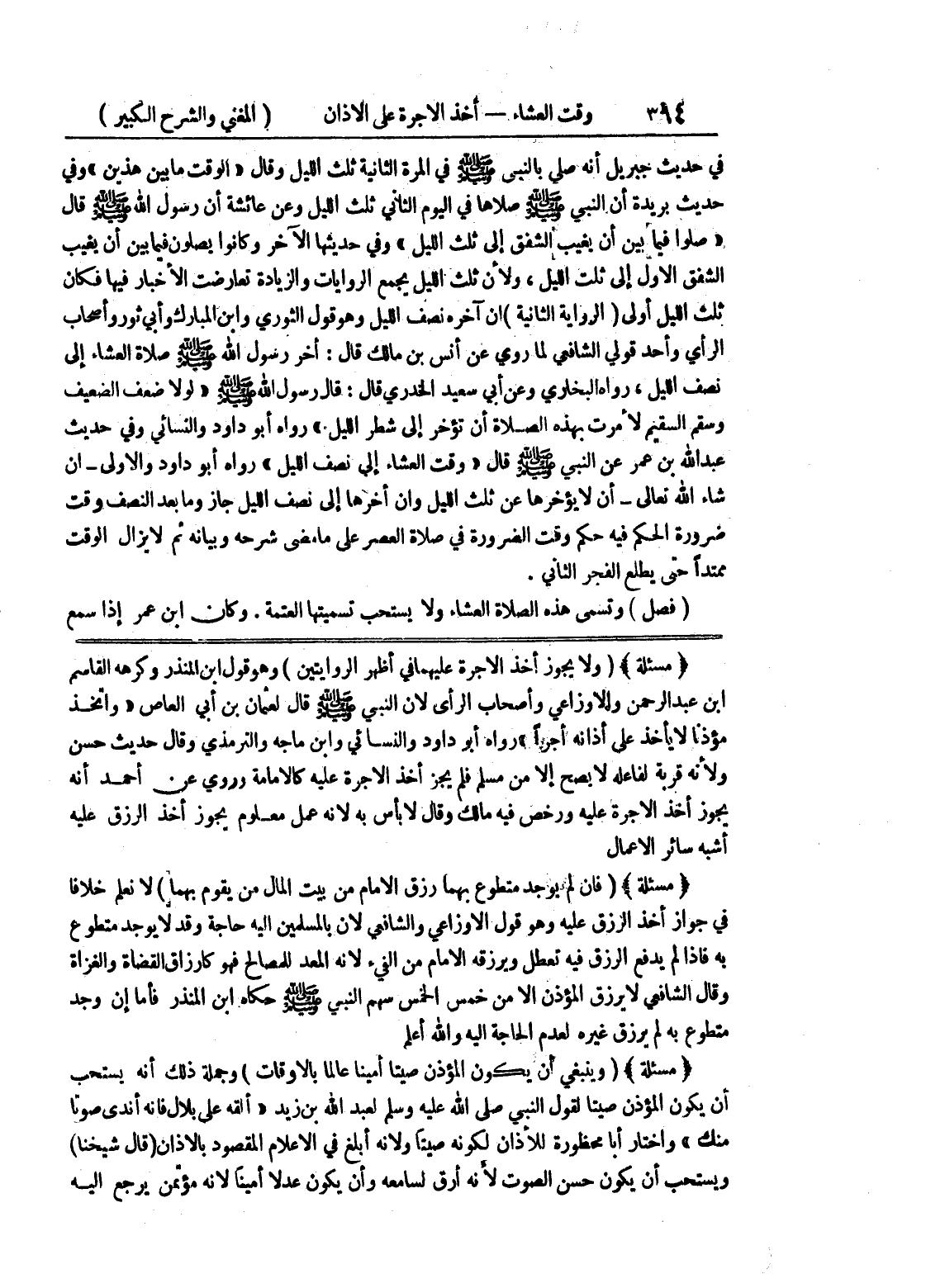 (مسألة) (ولا يجوز أخذ الأجرة عليهما في أظهر الروايتين) وهو قول ابن المنذر وكرهه القاسم ابن عبد الرحمن والاوزاعي وأصحاب الرأي لأن النبي صلى الله عليه وسلم قال لعثمان بن أبي العاص " وإتخذ مؤذنا لا يأخذ على أذانه أجراً " رواه أبو داود والنسائي وابن ماجه والترمذي وقال حديث حسن ولأنه قربة لفاعله لا يصح إلا من مسلم فلم يجز أخذ الأجرة عليه كالإمامة وروى عن أحمد أنه يجوز أخذ الأجرة عليه ورخص فيه مالك وقال لا بأس به لأنه عمل معلوم يجوز أخذ الرزق عليه أشبه سائر الأعمال (مسألة) (فإن لم يوجد متطوع بهما رزق الامام من بيت المال من يقوم بهما) لا نعلم خلافاً في جواز أخذ الرزق عليه وهو قول الأوزاعي والشافعي لأن بالمسلمين إليه حاجة وقد لا يوجد متطوع به فإذا لم يدفع الرزق فيه تعطل ويرزقه الإمام من الفئ لأنه المعد للمصالح فهو كأرزاق القضاة والغزاة وقال الشافعي لا يرزق المؤذن إلا من خمس الخمس سهم النبي صلى الله عليه وسلم حكاه ابن المنذر فأما إن وجد متطوع به لم يرزق غيره لعدم الحاجة إليه والله أعلم (مسألة) (وينبغي أن يكون المؤذن صيتاً أميناً عالماً بالأوقات) وجملة ذلك أنه يستحب أن يكون المؤذن صيتاً لقول النبي صلى الله عليه وسلم لعبد الله بن زيد " ألقه على بلال فإنه أندى صوتاً منك " واختار أبا محظورة للأذان لكونه صيتاً ولأنه أبلغ في الإعلام المقصود بالأذان (قال شيخنا) ويستحب أن يكون حسن الصوت لأنه أرق لسامعه وأن يكون عدلاً أميناً لأنه مؤتمن يرجع إليه
