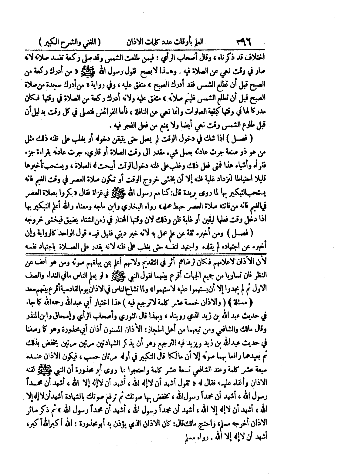لأن الأذان لاعلامهم فكان لرضاهم أثر في التقديم ولأنهم أعلم بمن يبلغهم صوته ومن هو أعف عن النظر فإن تساويا من جميع الجهات أقرع بينهما لقول النبي صلى الله عليه وسلم " لو يعلم الناس ما في النداء والصف الأول ثم لم يجدوا إلا أن يستهموا عليه لأستهموا " ولما تشاح الناس في الأذان يوم القادسية أقرع بينهم سعد (مسألة) (والأذان خمسة عشر كلمة لا ترجيع فيه) هذا اختيار أبي عبد الله رحمه الله كما جاء في حديث عبد الله بن زيد الذي رويناه، وبهذا قال الثوري وأصحاب الرأي وإسحاق وابن المنذر وقال مالك والشافعي ومن تبعهما من أهل الحجاز: الأذان المسنون أذان أبي محذورة وهو كما وصفنا في حديث عبد الله بن زيد ويزيد فيه الترجيع وهو أن يذكر الشهادتين مرتين مرتين يخفض بذلك ثم يعيدهما رافعاً بهما صوته إلا أن مالكا قال التكبير في أوله مرتان حسب، فيكون الأذان عنده سبعة عشر كلمة وعند الشافعي تسعة عشر كلمة واحتجوا بما روي أبو محذورة أن النبي صلى الله عليه وسلم لقنه الأذان وألقاه عليه فقال له " تقول أشهد ان لا إله الله، أشهد ان لا إله إلا الله، أشهد أن محمداً رسول الله، أشهد أن محمداً رسول الله، تخفض بها صوتك ثم ترفع صوتك بالشهادة أشهد ان لا إله إلا