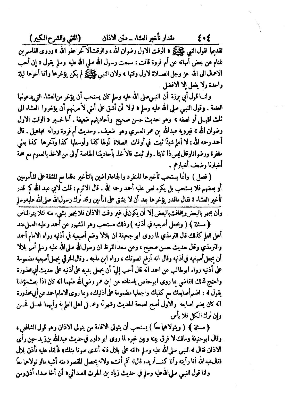 وأن يجهر بالبعض ويخافت بالبعض إلا أن يكون في غير وقت الأذان فلا يجهر بشئ منه لئلا يغر الناس (مسألة) (ويجعل أصبعيه في أذنيه) وذلك مستحب وهو المشهور عن أحمد وعليه العمل عند أهل العلم كذلك قال الترمذي لما روى أبو جحيفة أن بلالاً وضع أصبعيه في أذنيه رواه الإمام أحمد والترمذي وقال حديث حسن صحيح، وعن سعد القرظ أن رسول الله صلى الله عليه وسلم أمر بلالاً أن يجعل أصبعيه في أذنيه وقال أنه أرفع لصوتك، رواه ابن ماجه.