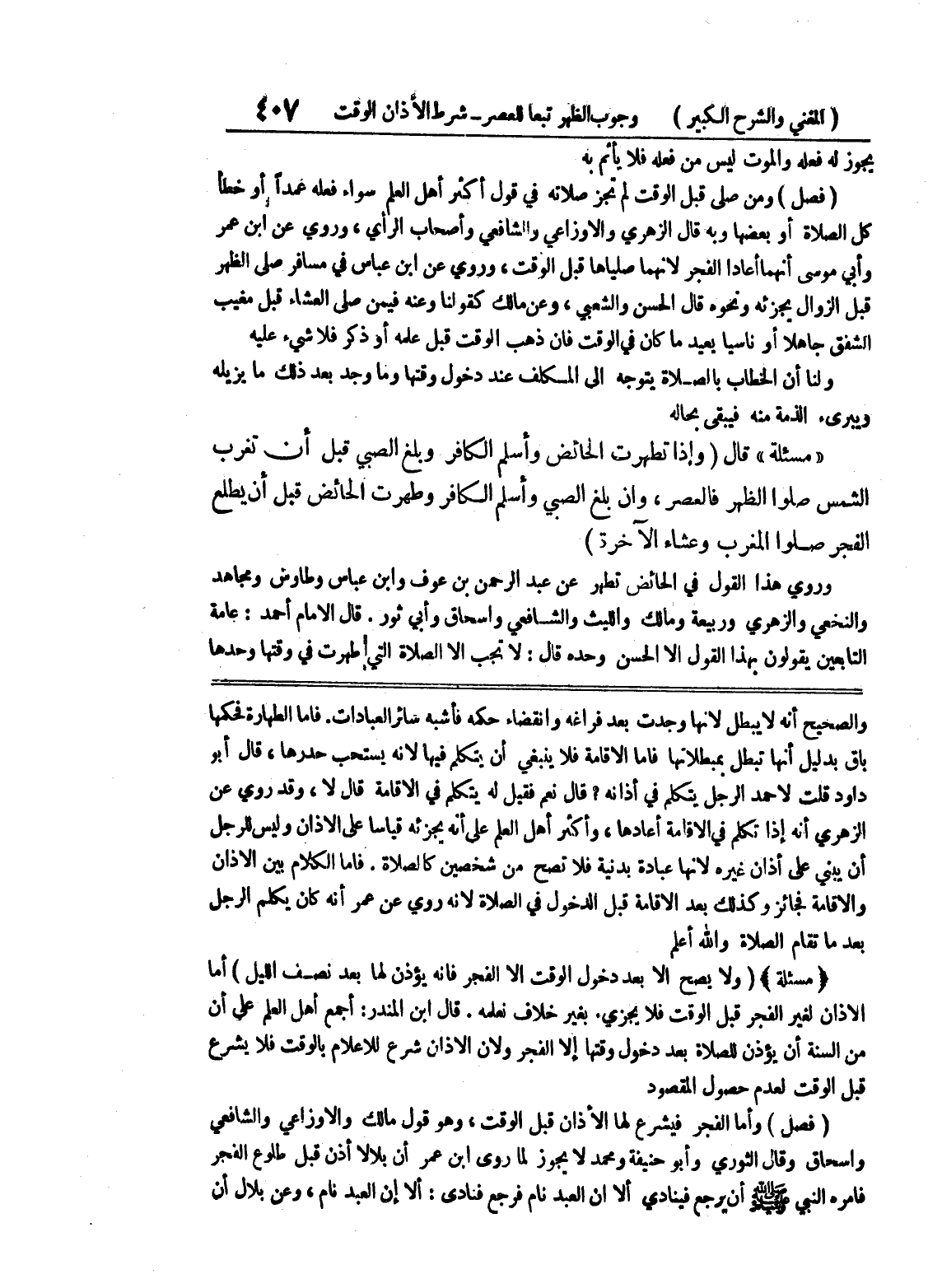 قال ابن المندر: أجمع أهل العلم على أن من السنة أن يؤذن للصلاة بعد دخول وقتها إلا الفجر ولأن الأذان شرع للإعلام بالوقت فلا يشرع قبل الوقت لعدم حصول المقصود (فصل) وأما الفجر فيشرع لها الأذان قبل الوقت، وهو قول مالك والاوزاعي والشافعي واسحاق وقال الثوري وأبو حنيفة ومحمد لا يجوز لما روى ابن عمر أن بلالاً أذن قبل طلوع الفجر فأمره النبي صلى الله عليه وسلم إن يرجع فينادي إلا أن العبد نام فرجع فنادى: إلا أن العبد نام، وعن بلال أن