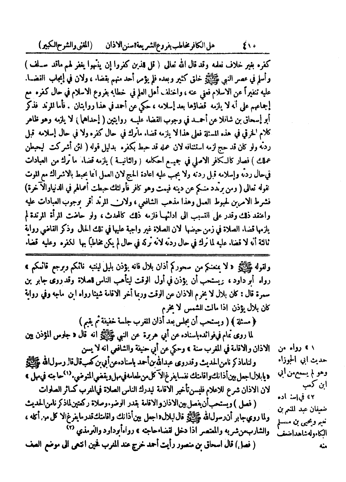 ولقوله صلى الله عليه وسلم " لا يمنعنكم من سحوركم أذان بلال فإنه يؤذن بليل لينتبه نائمكم ويرجع قائمكم " رواه أبو داود، ويستحب أن يؤذن في أول الوقت ليتأهب الناس للصلاة وقد روى جابر بن سمرة قال: كان بلال لا يخرم الأذان عن الوقت وربما أخر الإقامة شيئاً رواه ابن ماجه وفي رواية كان بلال يؤذن إذا مالت الشمس لا يخرم (مسألة) (ويستحب أن يجلس بعد أذان المغرب جلسة خفيفة ثم يقيم) لما روى تمام في فوائده بإسناده عن أبي هريرة عن النبي صلى الله عليه وسلم أنه قال " جلوس المؤذن بين الأذان والإقامة في المغرب سنة " وحكي عن أبي حنيفة والشافعي أنه لا يسن ولنا ما ذكرنا من الحديث وقد روى عبد الله بن أحمد بإسناده عن أبي بن كعب قال قال رسول الله صلى الله عليه وسلم " يا بلال إجعل بين أذانك وإقامتك نفساً يفرغ الآكل من طعامه في مهل ويقضي المتوضئ (1) حاجته في مهل " لأن الأذان شرع للإعلام فليسن تأخير الإقامة ليدرك الناس الصلاة في المغرب كسائر الصلوات (فصل) ويستحب أن يفصل بنى الأذان والإقامة بقدر الوضوء وصلاة ركعتين لما ذكرنا من الحديث ولما روى جابر أن رسول الله صلى الله عليه وسلم قال لبلال " إجعل بين أذانك وإقامتك قدر ما يفرغ الا كل من أكله، والشارب من شربه والمعتصر إذا دخل لقضاء حاجته " رواه أبو داود والترمذي (2)