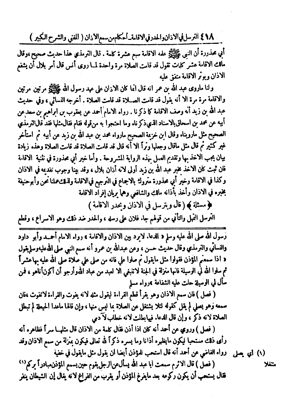 رسول الله صلى الله عليه وسلم " الدعاء لا يرد بين الأذان والإقامة " رواه الإمام أحمد وأبو داود والنسائي والترمذي وقال حديث حسن، وعن عبد الله بن عمرو أنه سمع النبي صلى الله عليه وسلم يقول " إذا سمعتم المؤذن فقولوا مثل ما يقول ثم صلوا علي فإنه من صلى علي صلاة صلى الله عليه بها عشراً ثم سلوا الله لي الوسيلة فإنها منزلة في الجنة لا تنبغي إلا لعبد من عباد الله وأرجو أن أكون أنا هو، فمن سأل لي الوسيلة حلت عليه الشفاعة " رواه مسلم (فصل) فإن سمع الأذان وهو يقرأ قطع القراءة ليقول مثله لأنه يفوت والقراءة لا تفوت، فإن سمعه وهو يصلي لم يقل كقوله لئلا يشتغل عن الصلاة بما ليس منها، وإن قالها ما عدا الحيعلة لم تبطل الصلاة لأنه ذكر، وإن قال الدعاء فيها بطلت لأنه خطاب لآدمي (فصل) وروى عن أحمد أنه كان إذا أذن فقال كلمة من الأذان قال مثلها سراً فظاهره أنه رأى ذلك مستحبا ليكون ما يظهره أذاناً وما يسره ذكرا لله تعالى فيكون بمنزلة من سمع الأذان وقد رواه القاضي عن أحمد أنه قال استحب للمؤذن أيضاً أن يقول مثل ما يقول في خفية (فصل) قال الأثرم سمعت أبا عبد الله يسأل عن الرجل يقوم حين يسمع المؤذن مبادراً يركع (1)