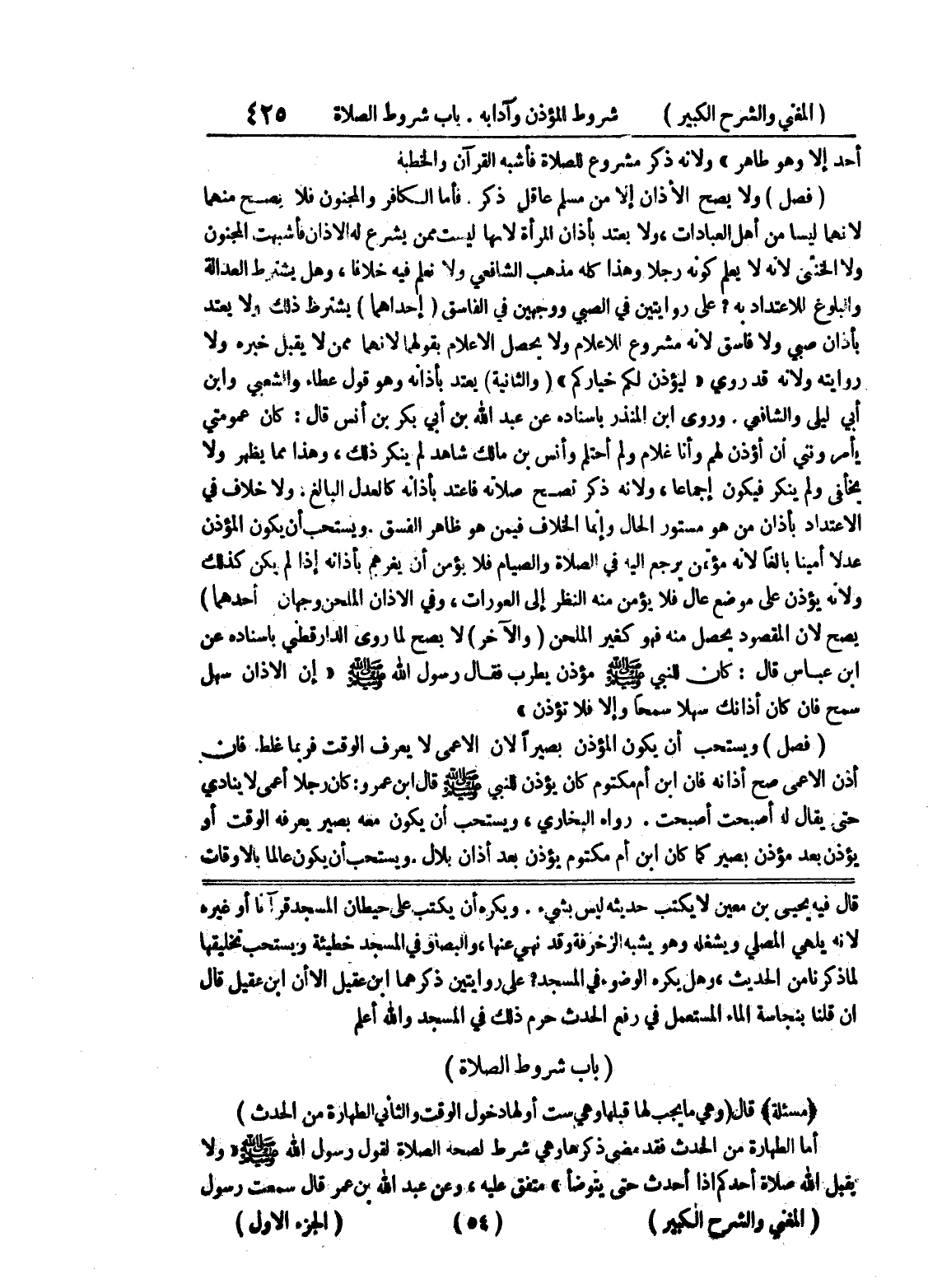 ويكره أن يكتب على حيطان المسجد قرآناً أو غيره لأنه يلهي المصلي ويشغله وهو يشبه الزخرفة وقد نهي عنها، والبصاق في المسجد خطيئة ويستحب تخليقها لما ذكرنا من الحديث، وهل يكره الوضوء في المسجد؟ على روايتين ذكرهما ابن عقيل إلا أن ابن عقيل قال إن قلنا بنجاسة الماء المستعمل في رفع الحدث حرم ذلك في المسجد والله أعلم (باب شروط الصلاة) (مسألة) قال (وهي ما يجب لها قبلها وهي ست أولها دخول الوقت والثاني الطهارة من الحدث) أما الطهارة من الحدث فقد مضى ذكرها وهي شرط لصحة الصلاة لقول رسول الله صلى الله عليه وسلم " ولا يقبل الله صلاة أحدكم إذا أحدث حتى يتوضأ " متفق عليه، وعن عبد الله بن عمر قال سمعت رسول