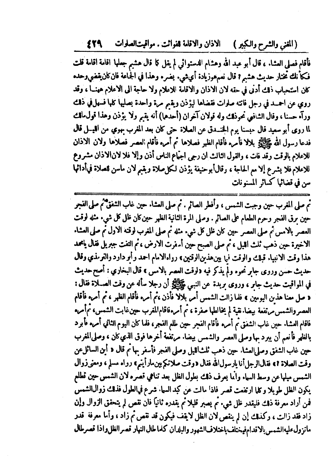 وصلى المرة الثانية الظهر حين كان ظل كل شئ مثله لوقت العصر بالأمس ثم صلى العصر حين كان ظل كل شئ مثله ثم صلى المغرب لوقته الأول ثم صلى العشاء الاخيرة حين ذهب ثلث الليل، ثم صلى الصبح حين أسفرت الأرض، ثم التفت جبريل فقال يا محمد هذا وقت الأنبياء قبلك والوقت فيما بين هذين الوقتين " رواه الإمام أحمد وأبو داود والترمذي وقال حديث حسن وروى جابر نحوه ولم يذكر فيه " لوقت العصر بالأمس " قال البخاري: أصح حديث في المواقيت حديث جابر، وروى بريدة عن النبي صلى الله عليه وسلم أن رجلاً سأله عن وقت الصلاة فقال: " صل معنا هذين اليومين " فلما زالت الشمس أمر بلالاً فأذن، ثم أمره فأقام الظهر، ثم أمره فأقام العصر والشمس مرتفعة بيضاء نقية لم يخالطها صفرة، ثم أمره فأقام المغرب حين غابت الشمس، ثم أمره فأقام العشاء حين غاب الشفق ثم أمره فأقام الفجر حين طلع الفجر، فلما كان اليوم الثاني أمره فأبرد بالظهر فأنعم أن يبرد بها وصلى العصر والشمس بيضاء مرتفعة أخرها فوق الذي كان، وصلى المغرب حين غاب الشفق وصلى العشاء حين ذهب ثلث الليل وصلى الفجر فأسفر بها ثم قال " أين السائل عن وقت الصلاة؟ " فقال الرجل أنا يا رسول الله فقال " وقت صلاتكم بين ما رأيتم " رواه مسلم، ومعنى زوال الشمس ميلها عن وسط السماء وإنما يعرف ذلك بطول الظل بعد تناهي قصره لأن الشمس حين تطلع يكون الظل طويلاً وكلما ارتفعت قصر فإذا مالت عن كبد السماء شرع في الطول فذلك زوال الشمس فمن أراد معرفة ذلك فليقدر ظل شئ ثم يصبر قليلاً ثم يقدره ثانياً فإن نقص لم يتحقق الزوال وإن زاد فقد زالت، وكذلك إن لم ينقص لأن الظل لا يقف فيكون قد نقص ثم زاد، وأما معرفة قدر ما تزول عليه الشمس بالأقدام فيختلف بإختلاف الشهور والبلدان كلما طال النهار قصر الظل وإذا قصر طال