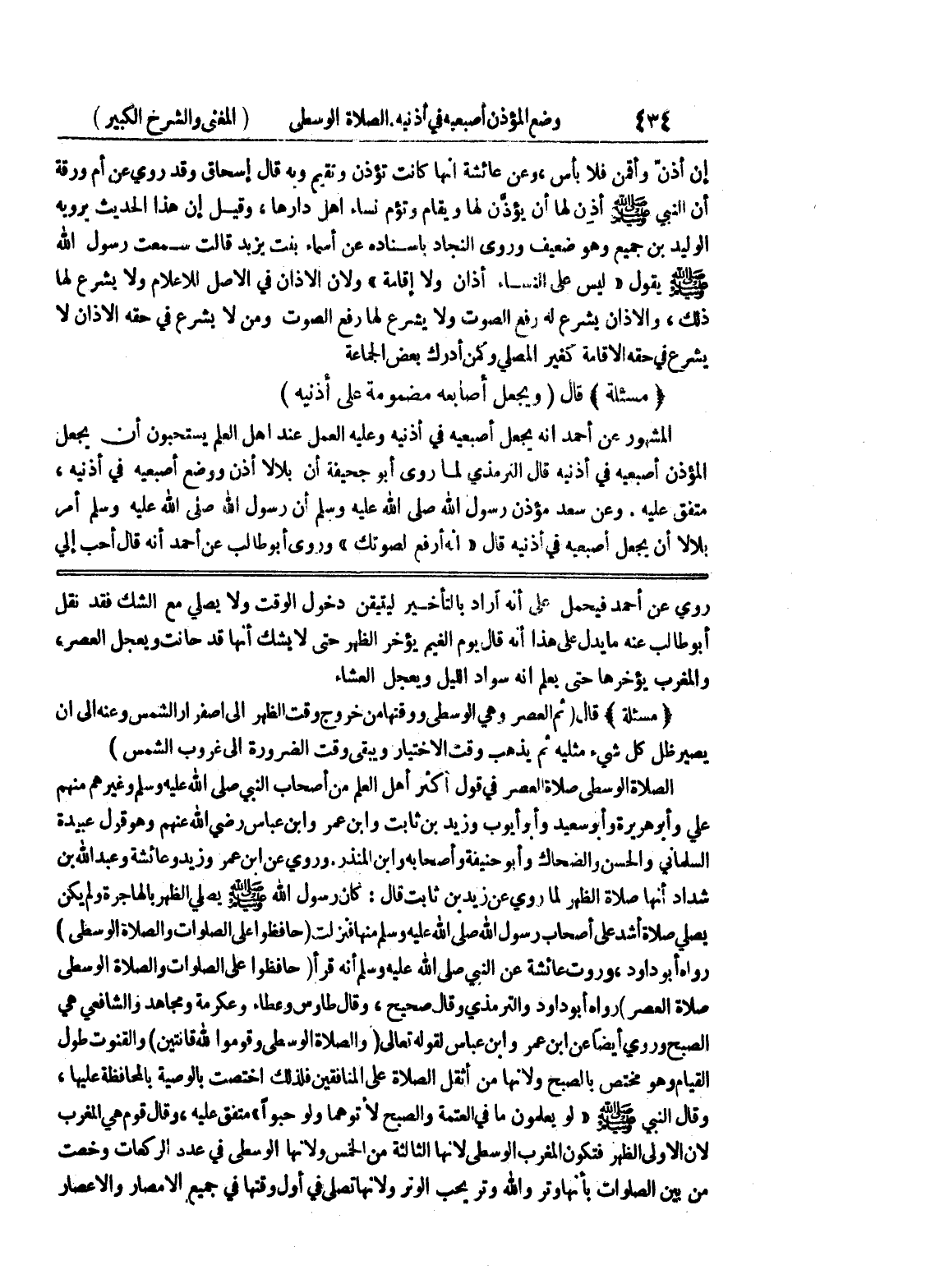 روي عن أحمد فيحمل على أنه أراد بالتأخير ليتيقن دخول الوقت ولا يصلي مع الشك فقد نقل أبو طالب عنه ما يدل على هذا أنه قال يوم الغيم يؤخر الظهر حتى لا يشك أنها قد حانت ويعجل العصر، والمغرب يؤخرها حتى يعلم أنه سواد الليل ويعجل العشاء (مسألة) قال (ثم العصر وهي الوسطى ووقتها من خروج وقت الظهر إلى إصفرار الشمس وعنه إلى أن يصير ظل كل شئ مثليه ثم يذهب وقت الاختيار ويبقى وقت الضرورة إلى غروب الشمس) الصلاة الوسطى صلاة العصر في قول أكثر أهل العلم من أصحاب النبي صلى الله عليه وسلم وغيرهم منهم علي وأبو هريرة وأبو سعيد وأبو أيوب وزيد بن ثابت وابن عمر وابن عباس رضي الله عنهم وهو قول عبيدة السلماني والحسن والضحاك وأبو حنيفة وأصحابه وابن المنذر.