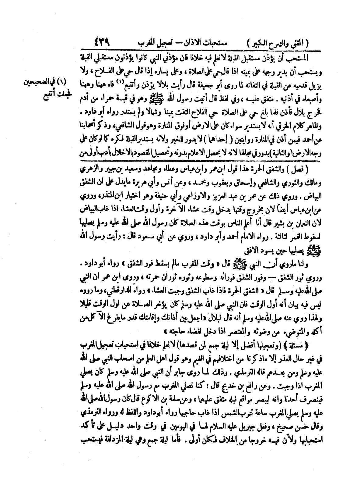 وروي ثور الشفق - وفور الشفق فورانه وسطوعه وثوره ثوران حمرته، وروى ابن عمر أن النبي صلى الله عليه وسلم قال " الشفق الحمرة فإذا غاب الشفق وجبت العشاء " رواه الدارقطني، وما رووه ليس فيه بيان أنه أول الوقت فإن النبي صلى الله عليه وسلم كان يؤخر الصلاة عن أول الوقت قليلاً ولهذا روي عنه صلى الله عليه وسلم أنه قال لبلال " إجعل بين أذانك وإقامتك قدر ما يفرغ الآكل من أكله والمتوضئ من وضوئه والمعتصر إذا دخل لقضاء حاجته " (مسألة) (وتعجيلها أفضل إلا ليلة جمع لمن قصدها) لا نعلم خلافاً في إستحباب تعجيل المغرب في غير حال العذر إلا ما ذكرنا من إختلافهم في الغيم وهو قول أهل العلم من أصحاب النبي صلى الله عليه وسلم ومن بعدهم قاله الترمذي.