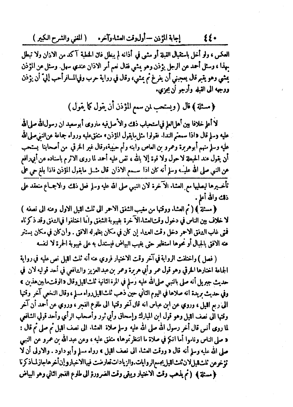 الجماعة اختارها الخرقي وهو قول عمر وأبي هريرة وعمر بن عبد العزيز والشافعي في أحد قوليه لأن في حديث جبريل إنه صلى بالنبي صلى الله عليه وسلم في المرة الثانية ثلث الليل وقال " الوقت ما بين هذين " وفي حديث بريدة أنه صلاها في اليوم الثاني حين ذهب ثلث الليل رواه مسلم، وقال النخعي آخر وقتها إلى ربع الليل، وروي عن ابن عباس أنه قال آخر وقتها إلى طلوع الفجر، وروى عن أحمد أن آخر وقتها إلى نصف الليل وهو قول ابن المبارك وإسحاق وأبي ثور وأصحاب الرأي وأحد قولي الشافعي لما روى أنس قال أخر رسول الله صلى الله عليه وسلم صلاة العشاء إلى نصف الليل ثم صلى ثم قال: " صلى الناس وناموا أما إنكم في صلاة ما إنتظرتموها " متفق عليه، وعن عبد الله بن عمرو عن النبي صلى الله عليه وسلم أنه قال " ووقت العشاء إلى نصف الليل " رواه مسلم وأبو داود.