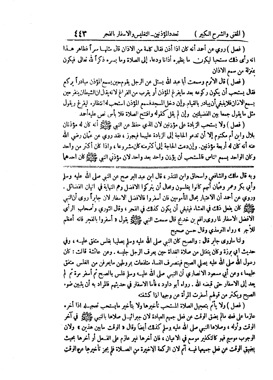 رواه أبو داود، فأما الأسفار في حديثهم فالمراد به أن يتبين ضوء الصبح ويكثر من قولهم أسفرت المرأة عن وجهها إذا كشفته (فصل) ولا يأثم بتعجيل الصلاة المستحب تأخيرها ولا بتأخير ما يستحب تعجيله إذا أخره عازماً على فعله ما لم يضق الوقت عن فعل جميع العبادة لأن جبرائيل صلاها بالنبي صلى الله عليه وسلم في آخر الوقت وأوله، وصلاها النبي صلى الله عليه وسلم كذلك أيضاً وقال " الوقت ما بين هذين " ولأن الوجوب موسع فهو كالتكفير موسع في الاعيان، فان أخرها غير عازم على الفعل أو أخرها بحيث