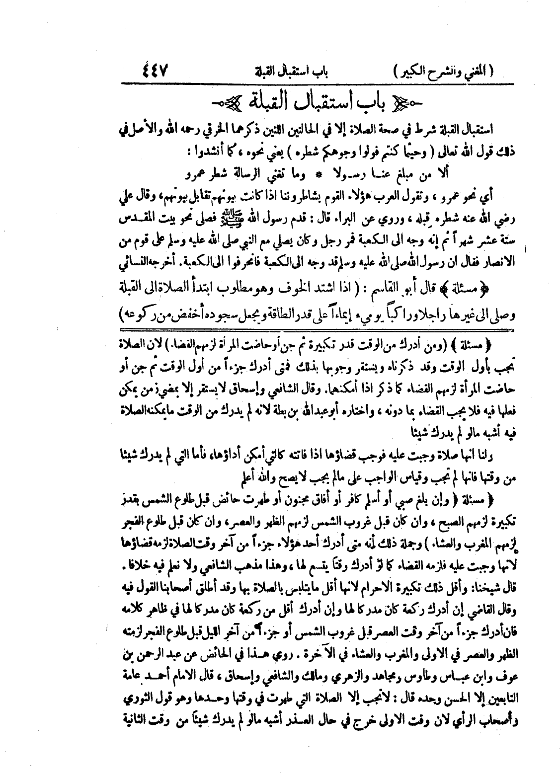 وقال الشافعي وإسحاق لا يستقر إلا بمضي زمن يمكن فعلها فيه فلا يجب القضاء بما دونه، وإختاره أبو عبد الله بن بطة لأنه لم يدرك من الوقت ما يمكنه الصلاة فيه أشبه مالو لم يدرك شيئاً ولنا أنها صلاة وجبت عليه فوجب قضاؤها إذا فاتته كالتي أمكن أداؤها، فأما التي لم يدرك شيئاً من وقتها فإنها لم تجب وقياس الواجب على ما لم يجب لا يصح والله أعلم (مسألة) وإن بلغ صبي أو أسلم كافر أو أفاق مجنون أو طهرت حائض قبل طلوع الشمس بقدر