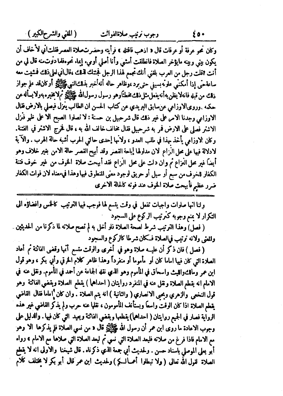 ولنا أنها صلوات واجبات تفعل في وقت يتسع لها فوجب فيها التريب كالخمس وافضاؤه إلى التكرار لا يمنع وجوبه كترتيب الركوع على السجود (فصل) وهذا الترتيب شرط لصحة الصلاة فلو أخل به لم تصح صلاته لما ذكرنا من الحديثين والمعنى ولأنه ترتيب في الصلاة فكان شرطاً كالركوع والسجود (فصل) فإن ذكر أن عليه صلاة وهو في أخرى والوقت متسع أتمها وقضى الفائتة ثم أعاد الصلاة التي كان فيها إماماً كان أو مأموماً أو منفرداً وهذا ظاهر كلام الخرقي وأبي بكر، وهو قول ابن عمر ومالك والليث واسحاق في المأموم وهو الذي نقله الجماعة عن أحمد في المأموم.