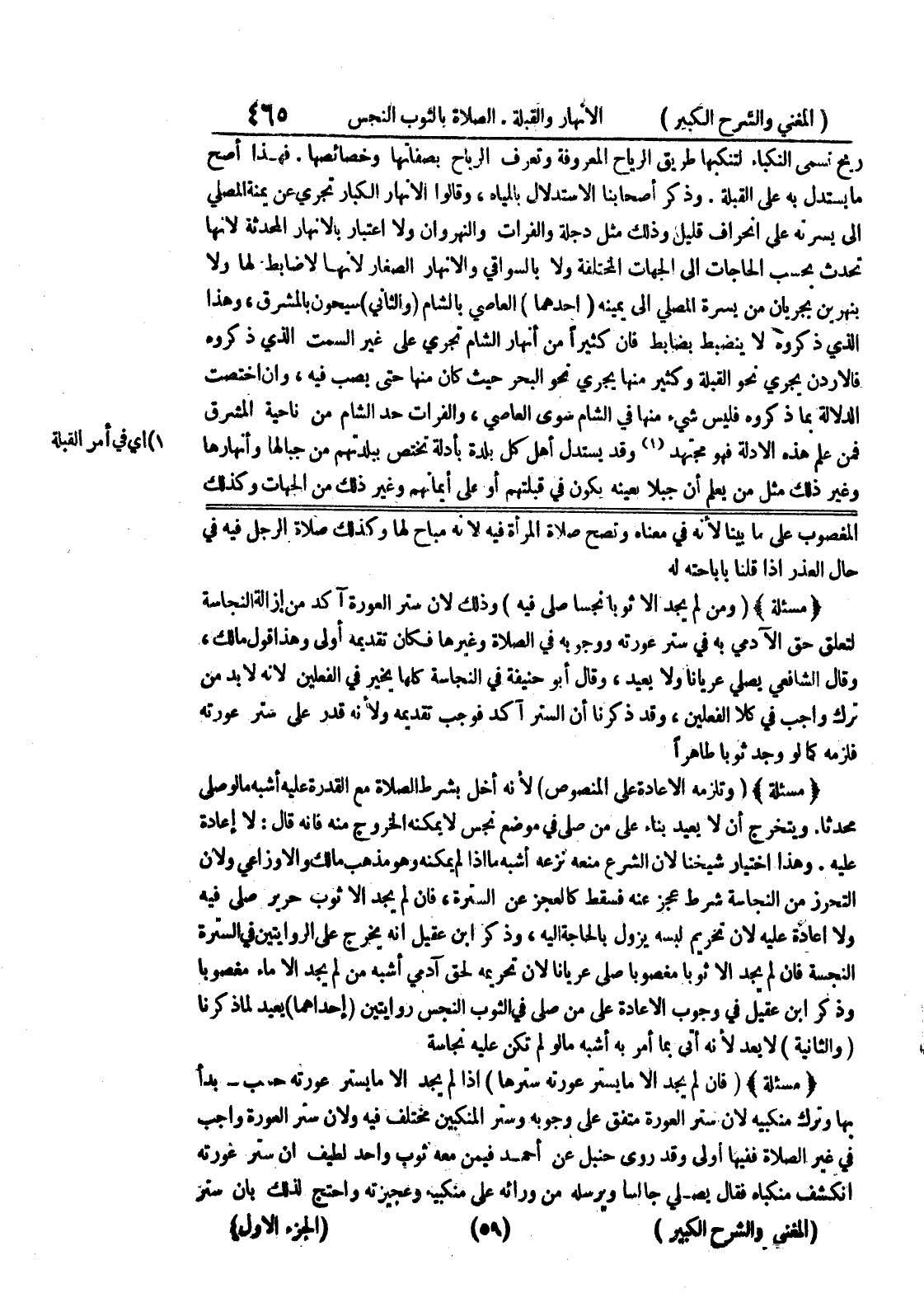 وهذا اختيار شيخنا لأن الشرع منعه نزعه أشبه ما إذا لم يمكنه وهو مذهب مالك والاوزاعي ولأن التحرز من النجاسة شرط عجز عنه فسقط كالعجز عن السترة، فان لم يجد إلا ثوب حرير صلى فيه ولا إعادة عليه لأن تحريم لبسه يزول بالحاجة إليه، وذكر ابن عقيل أنه يخرج على الروايتين في السترة النجسة فان لم يجد إلا ثوباً مغصوباً صلى عرياناً لأن تحريمه لحق آدمي أشبه من لم يجد إلا ماء مغصوباً وذكر ابن عقيل في وجوب الإعادة على من صلى في الثوب النجس روايتين (إحداهما) يعيد لما ذكرنا (والثانية) لا يعد لأنه أتى بما أمر به أشبه مالو لم تكن عليه نجاسة (مسألة) (فإن لم يجد إلا ما يستر عورته سترها) إذا لم يجد إلا ما يستر عورته حسب - بدأ بها وترك منكبيه لأن ستر العورة متفق على وجوبه وستر المنكبين مختلف فيه ولأن ستر العورة واجب في غير الصلاة ففيها أولى وقد روي حنبل عن أحمد فيمن معه ثوب واحد لطيف أن ستر عورته إنكشف منكباه فقال يصلي جالساً ويرسله من ورائه على منكبيه وعجيزته واحتج لذلك بأن ستر