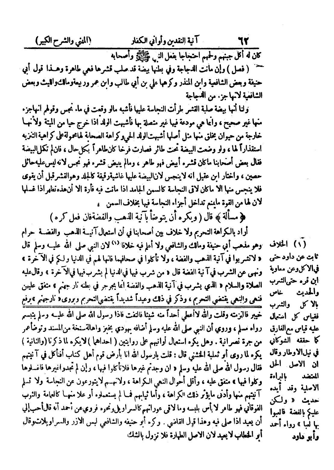 وهل يكره استعمال أوانيهم على روايتين (إحداهما) لا يكره لما ذكرنا (والثانية) يكره لما روى أبو ثعلبة الخشني قال: قلت يا رسول الله إنا بأرض قوم أهل كتاب أفنأكل في آنيتهم فقال رسول الله صلى الله عليه وسلم " إن وجدتم غيرها فلا تأكلوا فيها، وإن لم تجدوا غيرها فاغسلوها وكلوا فيها " متفق عليه، وأقل أحوال النهي الكراهة، ولأنهم لا يتورعون عن النجاسة ولا تسلم آنيتهم منها وأدنى ما يؤثر ذلك الكراهة، وأما ثيابهم فما لم يتسعملوه أو علا منها كالعمامة والثوب الفوقاني فهو طاهر لا بأس بلبسه وما لاقى عوراتهم كالسراويل ونحوه فروي عن أحمد أنه قال أحب إلي أن يعيد إذا صلى فيه وهذا قول القاضي.