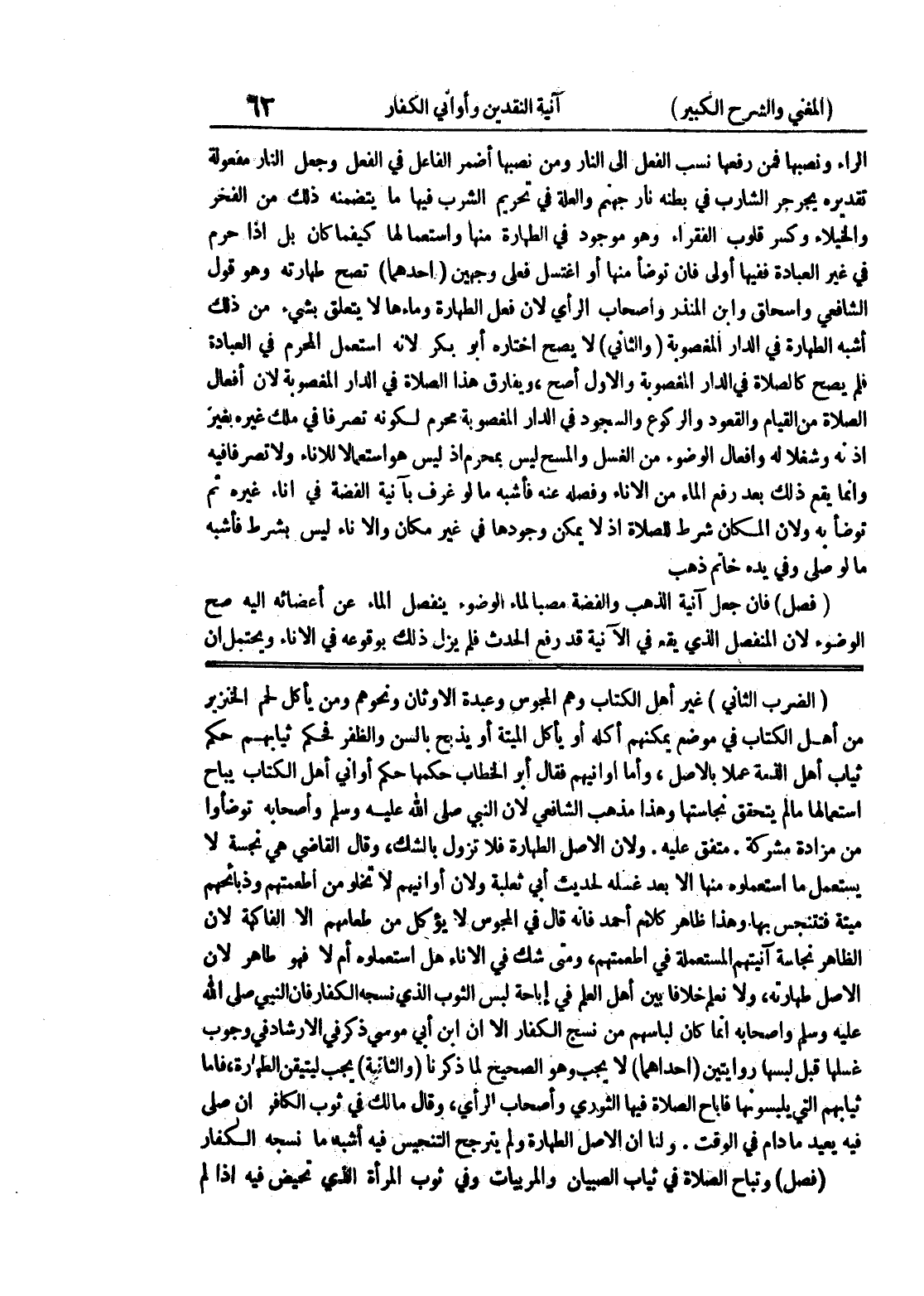 (الضرب الثاني) غير أهل الكتاب وهم المجوس وعبدة الأوثان ونحوهم ومن يأكل لحم الخنزير من أهل الكتاب في موضع يمكنهم أكله أو يأكل الميتة أو يذبح بالسن والظفر فحكم ثيابهم حكم ثياب أهل الذمة عملا بالأصل، وأما أوانيهم فقال أبو الخطاب حكمها حكم أواني أهل الكتاب يباح استعمالها ما لم يتحقق نجاستها وهذا مذهب الشافعي لأن النبي صلى الله عليه وسلم وأصحابه توضأوا من مزادة مشركة.
