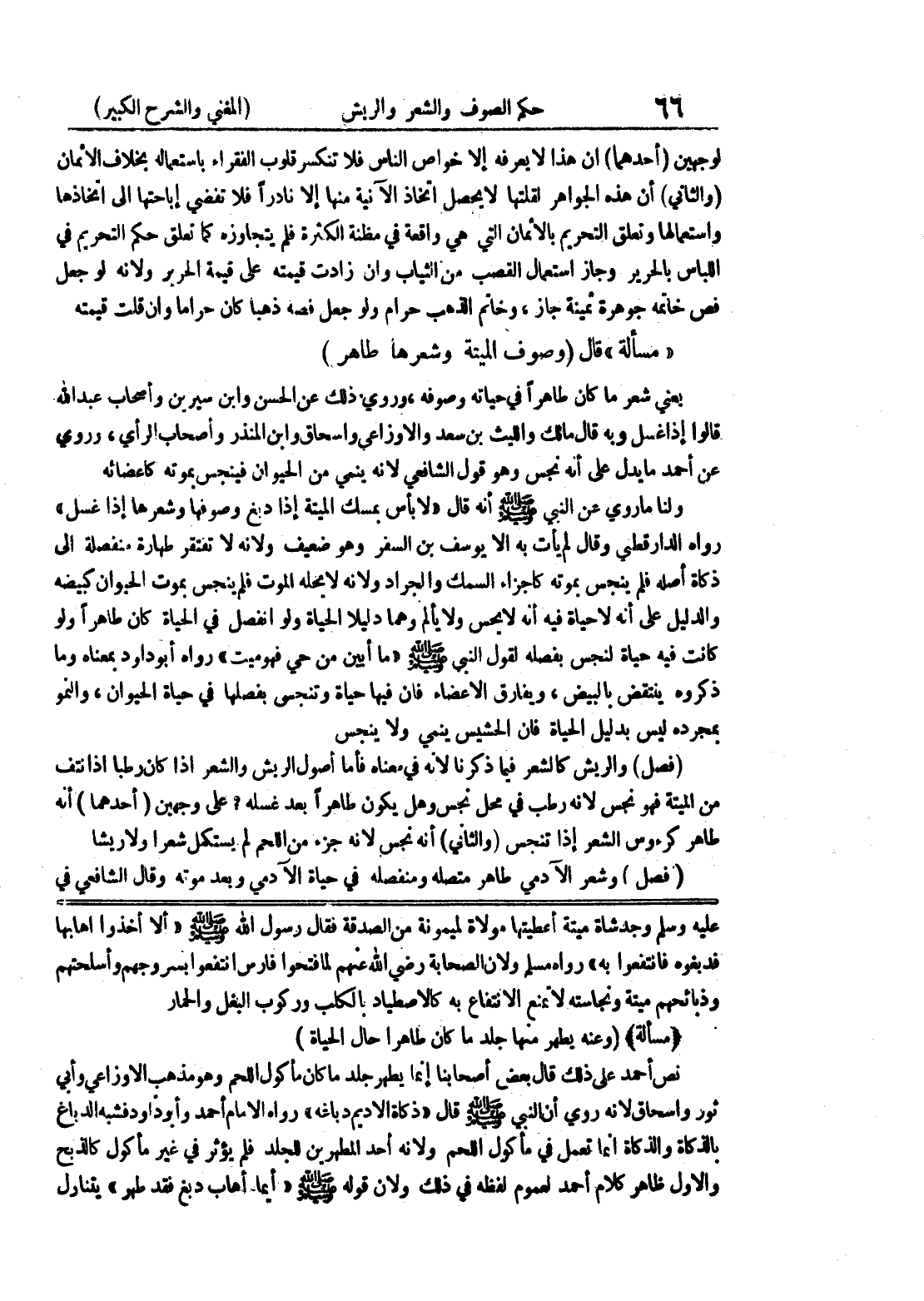 عليه وسلم وجد شاة ميتة أعطيتها مولاة لميمونة من الصدقة فقال رسول الله صلى الله عليه وسلم " ألا أخذوا إهابها فدبغوه فانتفعوا به " رواه مسلم ولأن الصحابة رضي الله عنهم لما فتحوا فارس انتفعوا بسروجهم وأسلحتهم وذبائحهم ميتة ونجاسته لا تمنع الانتفاع به كالاصطياد بالكلب وركوب البغل والحمار (مسألة) (وعنه يطهر منها جلد ما كان طاهرا حال الحياة) نص أحمد على ذلك قال بعض أصحابنا إنما يطهر جلد ما كان مأكول اللحم وهو مذهب الأوزاعي وأبي ثور واسحاق لأنه روي أن النبي صلى الله عليه وسلم قال " ذكاة الأديم دباغه " رواه الإمام أحمد وأبو داود فشبه الدباغ بالذكاة والذكاة إنما تعمل في مأكول اللحم ولأنه أحد المطهرين للجلد فلم يؤثر في غير مأكول كالذبح والأول ظاهر كلام أحمد لعموم لفظه في ذلك ولأن قوله صلى الله عليه وسلم " أيما إهاب دبغ فقد طهر " يتناول