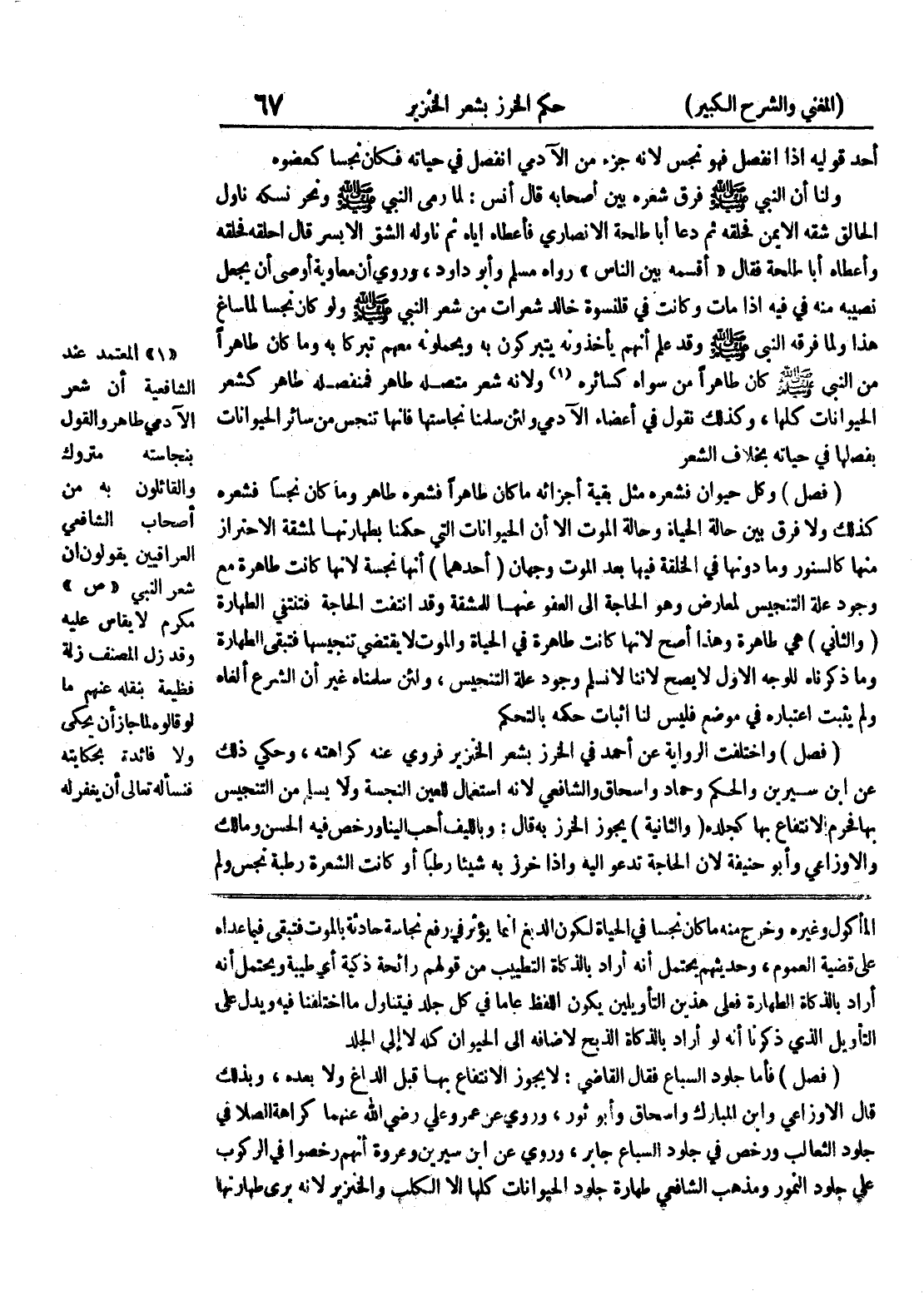 قال الاوزاعي وابن المبارك واسحاق وأبو ثور، وروي عن عمر وعلي رضي الله عنهما كراهة الصلا في جلود الثعالب ورخص في جلود السباع جابر، وروي عن ابن سيرين وعروة أنهم رخصوا في الركوب على جلود النمور ومذهب الشافعي طهارة جلود الحيوانات كلها إلا الكلب والخنزير لأنه يرى طهارتها
