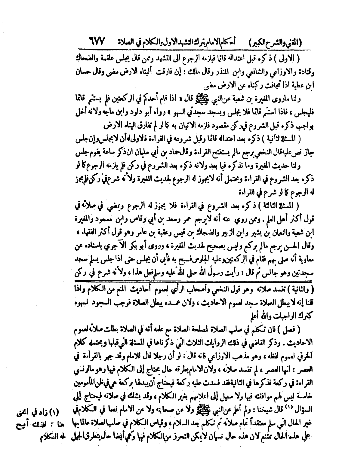 القراءة في ركعة فذكرها في الثانية فقد فسدت عليه ركعة فيحتاج أن يبدلها بركعة هي في ظن المأمومين خامسة ليس لهم موافقته فيهاو لا سبيل إلى إعلامهم بغير الكلام، وقد يشك في صلاته فيحتاج إلى السؤال (1) قال شيخنا: ولم أعلم عن النبي صلى الله عليه وسلم ولا عن صحابته ولا عن الإمام نصا في الكلام في غير الحال التي سلم معتقدا تمام صلاته ثم تكلم بعد السلام، وقياس الكلام في صلب الصلاة عالما بها على هذه الحال ممتنع لان هذه حال نسيان لا يمكن التحرز من الكلام فيها وهي أيضا حال يتطرق الجهل