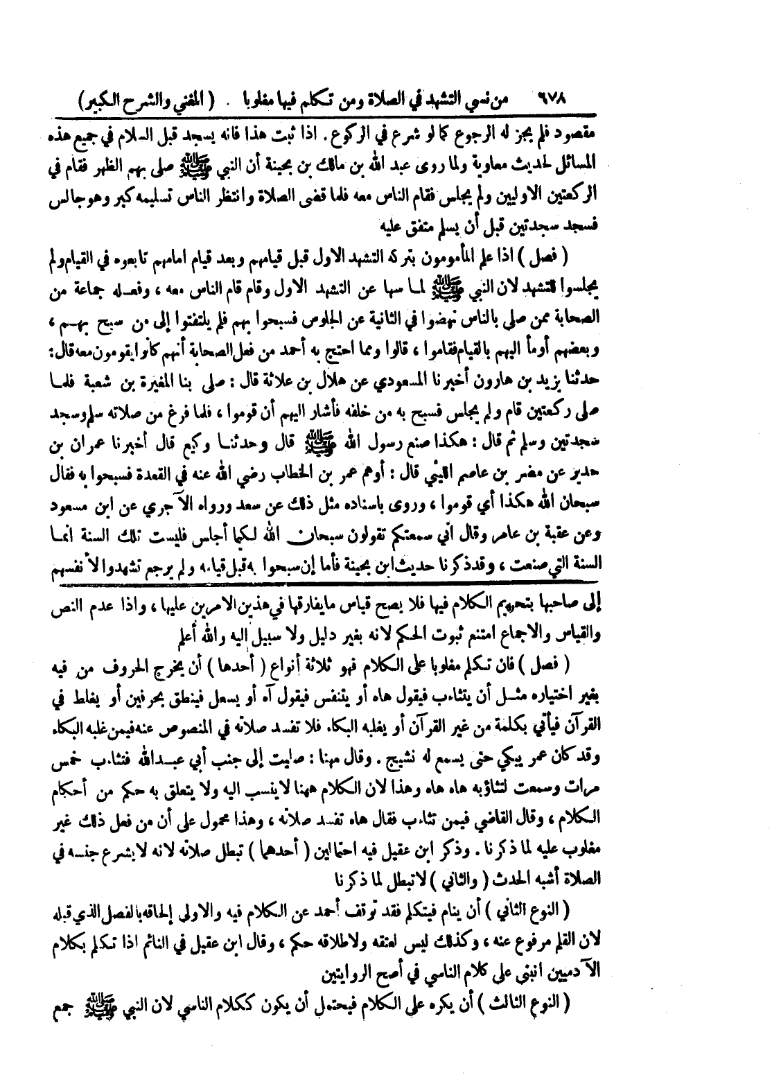 إلى صاحبها بتحريم الكلام فيها فلا يصح قياس ما يفارقها في هذين الأمرين عليها، وإذا عدم النص والقياس والاجما امتنع ثبوت الحكم لأنه بغير دليل ولا سبيل إليه والله أعلم (فصل) فإن تكلم مغلوبا على الكلام فهو ثلاثة أنواع (أحدها) أن يخرج الحروف من فيه بغير اختياره مثل أن يتثاءب فيقول هاه أو يتنفس فيقول آه أو يسعل فينطق بحرفين أو يغلط في القرآن فيأتي بكلمة من غير القرآن أو يغلبه البكاء فلا تفسد صلاته في المنصوص عنه فيمن غلبه البكاء وقد كان عمر يبكي حتى يسمع له نشيج.