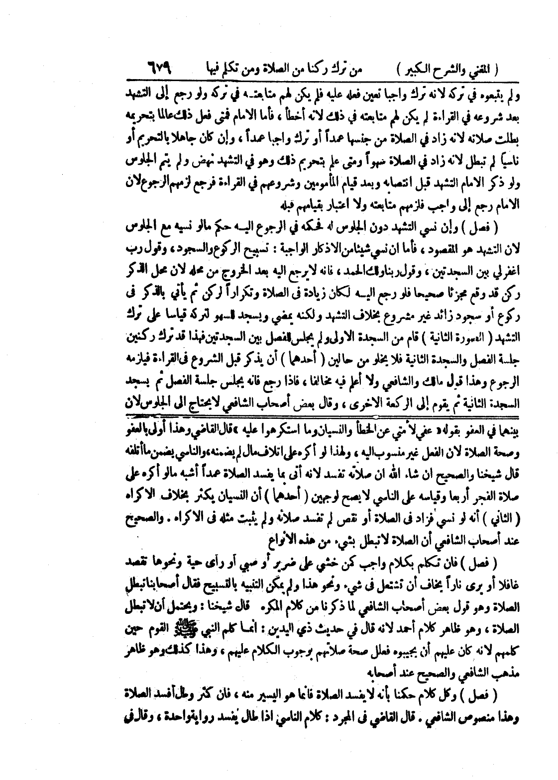 والصحيح عند أصحاب الشافعي إن الصلاة لا تبطل بشئ من هذه الأنواع (فصل) فإن تكلم بكلام واجب كمن خشي على ضرير أو صبي أو رأى حية ونحوها تقصد غافلا أو يرى نارا يخاف أن تشتعل في شئ ونحو هذا ولم يمكن التنبيه بالتسبيح فقال أصحابنا تبطل الصلاة وهو قول بعض أصحاب الشافعي لما ذكرنا من كلام المكره قال شيخنا: ويحتمل أن لا تبطل الصلاة، وهو ظاهر كلام أحمد لأنه قال في حديث ذي اليدين: إنما كلم النبي صلى الله عليه وسلم القوم حين كلمهم لأنه كان عليهم أن يجيبوه فعلل صحة صلاتهم بوجوب الكلام عليهم، وهذا كذلك وهو ظاهر مذهب الشافعي والحصيح عند أصحابه (فصل) وكل كلام حكمنا بأنه لا يفسد الصلاة فإنما هو اليسير منه، فإن كثر وطال أفسد الصلاة وهذا منصوص الشافعي.