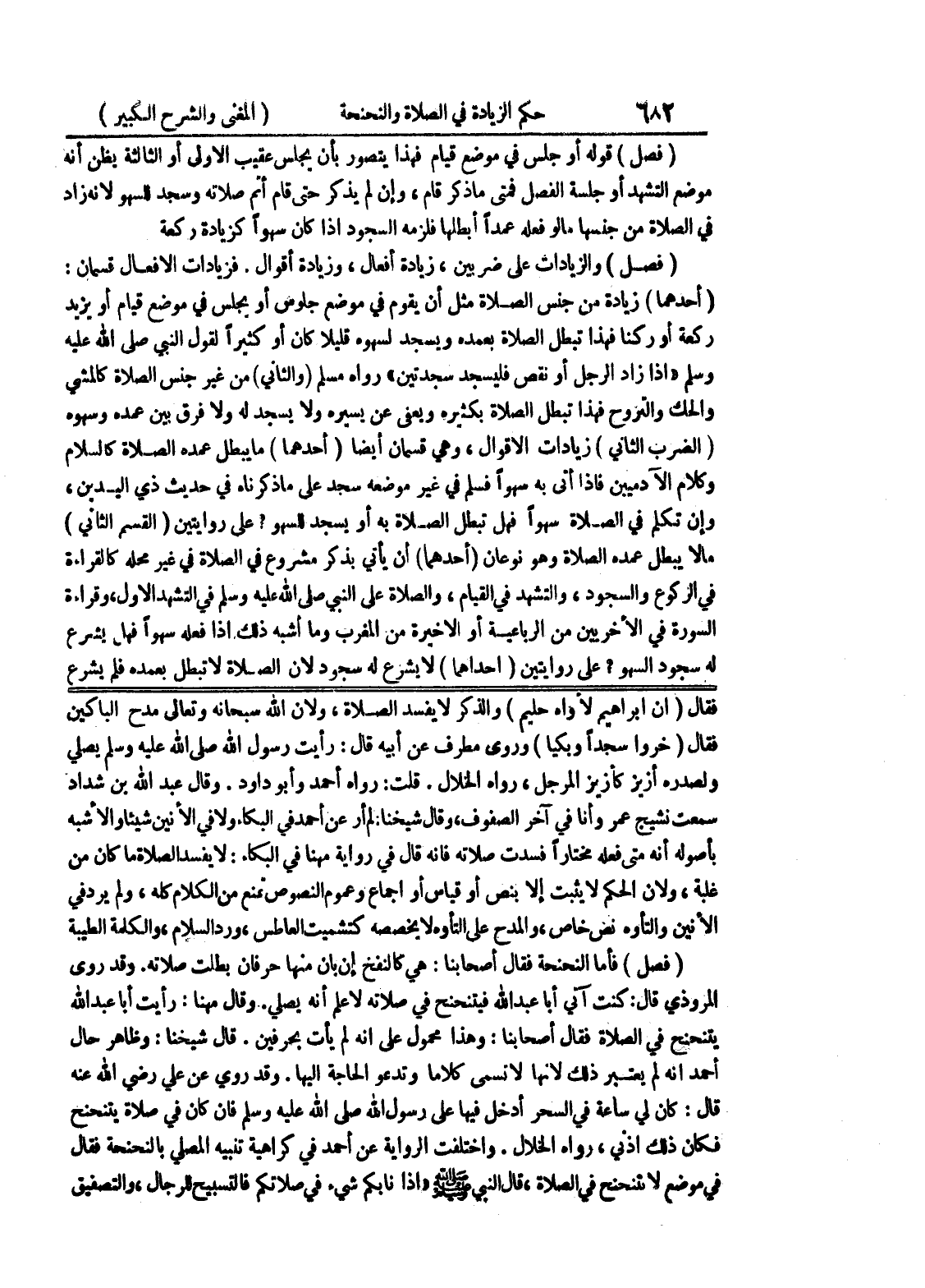 وقال عبد الله بن شداد سمعت نشيج عمر وأنا في آخر الصفوف، وقال شيخنا: لم أر عن أحمد في البكاء ولا في الأنين شيئا والأشبه بأصوله أنه متى فعله مختارا فسدت صلاته فإنه قال في رواية مهنا في البكاء: لا يفسد الصلاة ما كان من غلبة، ولأن الحكم لا يثبت إلا بنص أو قياس أو إجماع وعموم النصوص تمنع من الكلام كله، ولم يرد في الأنين والتأوه نص خاص، والمدح على التأوه لا يخصصه كتشميت العاطس، ورد السلام، والكلمة الطيبة (فصل) فأما النحنحة فقال أصحابنا: هي كالنفخ إن بان منها حرفان بطلت صلاته.
