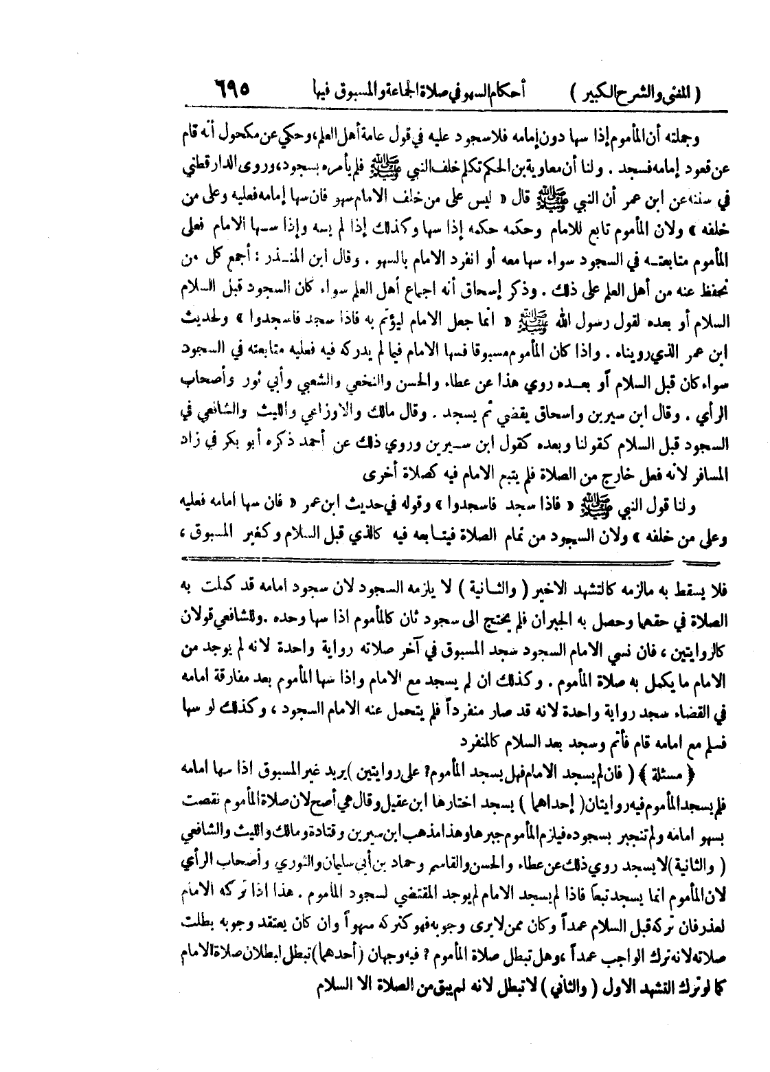 وكذلك إن لم يسجد مع الإمام وإذا سها المأموم بعد مفارقة إمامه في القضاء سجد رواية واحدة لأنه قد صار منفردا فلم يتحمل عنه الإمام السجود، وكذلك لو سها فسلم مع إمامه قام فأتم وسجد بعد السلام كالمنفرد (مسألة) (فإن لم يسجد الإمام فهل يسجد المأموم؟ على روايتين) يريد غير المسبوق إذا سها إمامه فلم يسجد المأموم فيه روايتان (إحداهما) يسجد اختارها ابن عقيل وقال هي أصح لأن صلاة المأموم نقصت بسهو إمامه ولم تنجبر بسجوده فيلزم المأموم جبرها وهذا مذهب ابن سيرين وقتادة ومالك والليث والشافعي (والثانية) لا يسجد روى ذلك عن عطاء والحسن والقاسم وحماد بن أبي سليمان والثوري وأصحاب الرأي لأن المأموم إنما يسجد تبعا فإذا لم يسجد الإمام لم يوجد المقتضي لسجود المأموم.