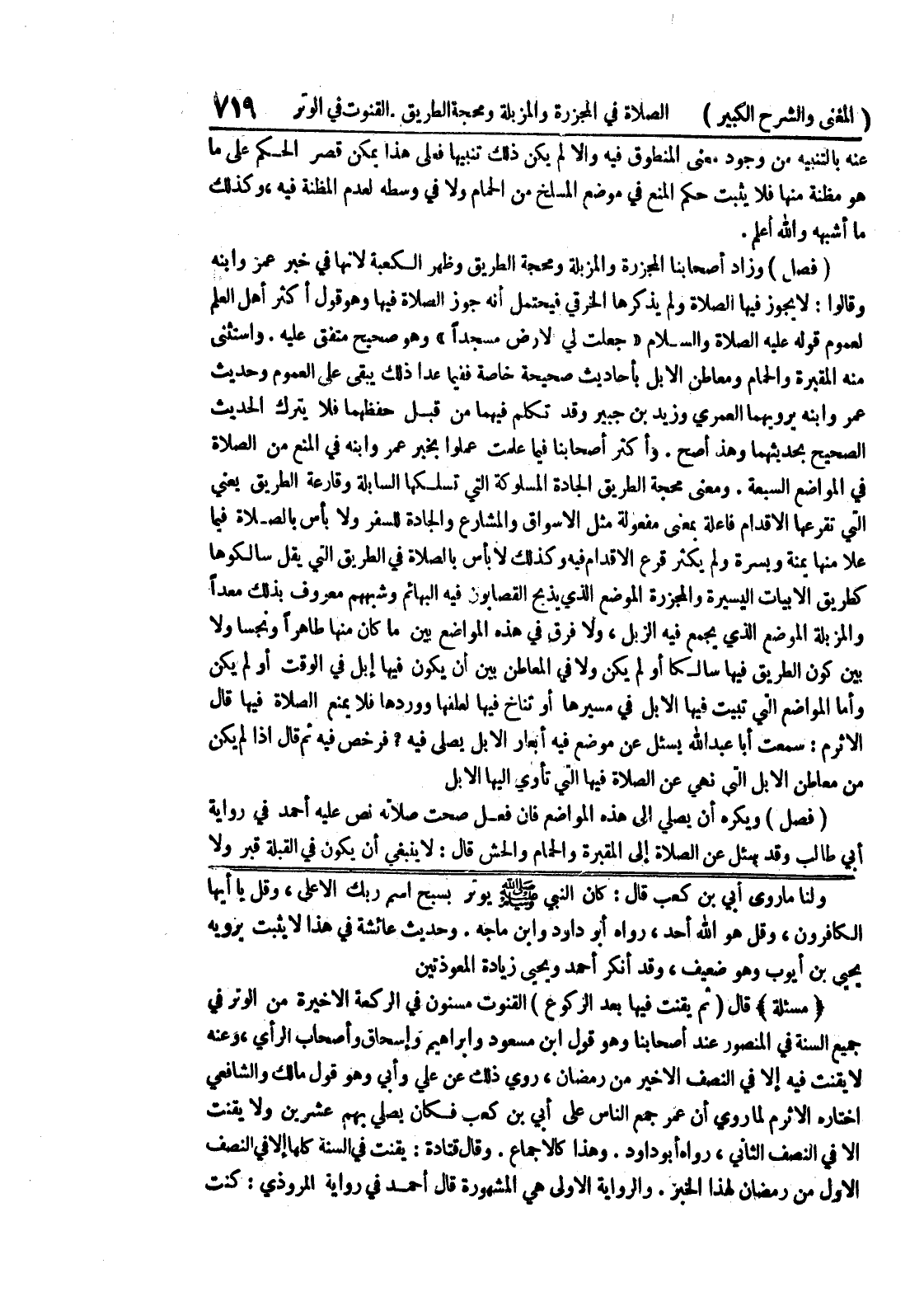 وحديث عائشة في هذا لا يثبت يرويه يحيى بن أيوب وهو ضعيف، وقد أنكر أحمد ويحيى زيادة المعوذتين (مسألة) قال (ثم يقنت فيها بعد الركوع) القنوت مسنون في الركعة الأخيرة من الوتر في جميع السنة في المنصور عند أصحابنا وهو قول ابن مسعود وابراهيم واسحاق وأصحاب الرأي، وعنه لا يقنت في إلا في النصف الأخير من رمضان، روى ذلك عن علي وأبي وهو قول مالك والشافعي اختاره الأثرم لما روي أن عمر جمع الناس على أبي بن كعب فكان يصلي بهم عشرين ولا يقنت إلا في النصف الثاني، رواه أبو داود.
