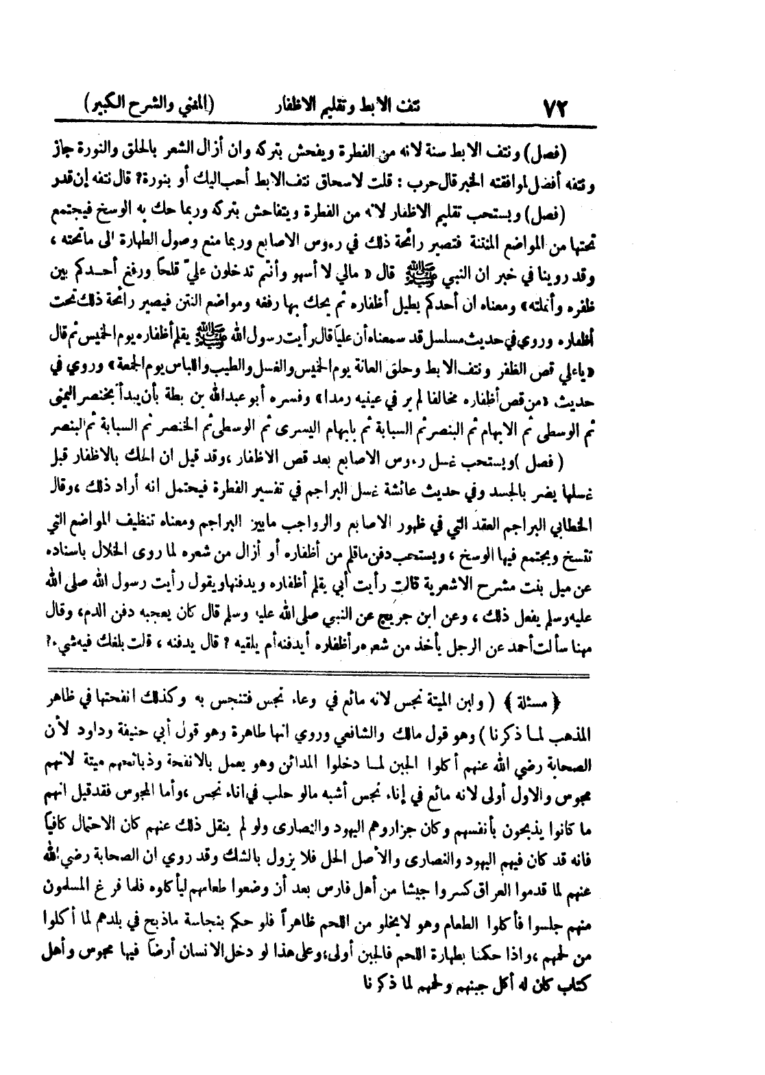 (مسألة) (ولبن الميتة نجس لأنه مائع في وعاء نجس فتنجس به وكذلك أنفحتها في ظاهر المذهب لما ذكرنا) وهو قول مالك والشافعي وروي أنها طاهرة وهو قول أبي حنيفة وداود لأن الصحابة رضي الله عنهم أكلوا الجبن لما دخلوا المدائن وهو يعمل بالأنفحة وذبائحهم ميتة لأنهم مجوس والأول أولى لأنه مائع في إناء نجس أشبه مالو حلب في إناء نجس، وأما المجوس فقد قيل إنهم ما كانوا يذبحون بأنفسهم وكان جزاروهم اليهود والنصارى ولو لم ينقل ذلك عنهم كان الاحتمال كافيا فإنه قد كان فيهم اليهود والنصارى والأصل الحل فلا يزول بالشك وقد روي أن الصحابة رضي الله عنهم لما قدموا العراق كسروا جيشا من أهل فارس بعد أن وضعوا طعامهم ليأكلوه فلما فرغ المسلمون منهم جلسوا فأكلوا الطعام وهو لا يخلو من اللحم ظاهرا فلو حكم بنجاسة ما ذبح في بلدهم لما أكلوا من لحمهم، وإذا حكمنا بطهارة اللحكم فالجبن أولى، وعلى هذا لو دخل الإنسان أرضا فيها مجوس وأهل كتاب كان له أكل جبنهم ولحمهم لما ذكرنا