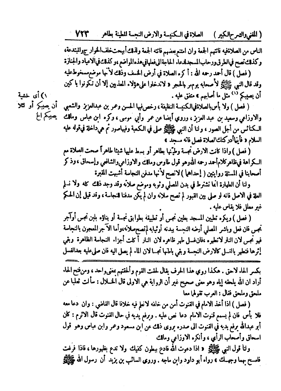 هكذا روي هذا الحرف يقال لحقت القوم وألحقتهم بمعنى واحد، ومن فتح الحاء أراد أن الله يحلقه إياه وهو معنى صحيح غير أن الرواية هي الأولى قال الخلال: سألت ثعلبا عن محلق وملحق فقال: العرب تقولهما معا (فصل) إذا أخذ الإمام في القنوت أمن من خلفه لا نعلم فيه خلافاً قال القاضي: وإن دعا معه فلا بأس فإن لم يسمع قنوت الإمام دعا نص عليه.