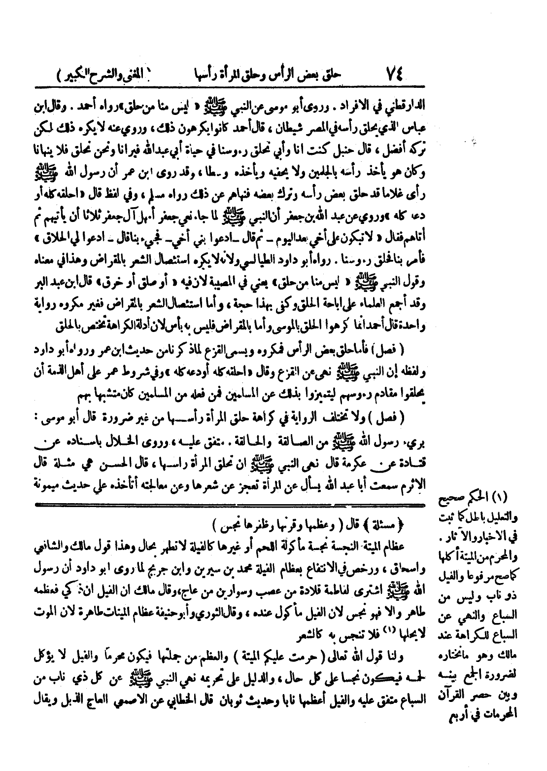واسحاق، ورخص في الانتفاع بعظام الفيلة محمد بن سيرين وابن جريج لما روى أبو داود أن رسول الله صلى الله عليه وسلم اشترى لفاطمة قلادة من عصب وسوارين من عاج، وقال مالك إن الفيل إن ذكي فعظمه طاهر وإلا فهو نجس لأن الفيل مأكول عنده، وقال الثوري وأبو حنيفة عظام الميتات طاهرة لأن الموت لا يحلها (1) فلا تنجس به كالشعر ولنا قول الله تعالى (حرمت عليكم الميتة) والعظم من جملتها فيكون محرما والفيل لا يؤكل لحمه فيكون نجسا على كل حال، والدليل على تحريمه نهى النبي صلى الله عليه وسلم عن كل ذي ناب من السباع متفق عليه والفيل أعظمها نابا وحديث ثوبان قال الخطابي عن الأصمعي العاج الذبل ويقال