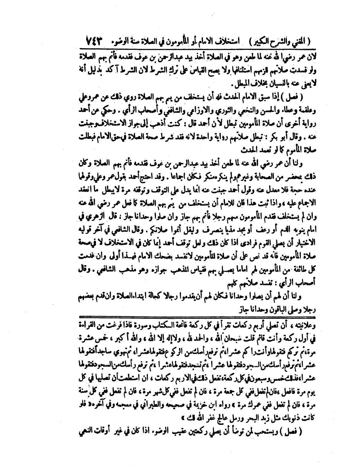 وعلانيته، أن تصلي أربع ركعات تقرأ في كل ركعة فاتحة الكتاب وسورة فإذا فرغت من القراءة في أول ركعة وأنت قائم قلت سبحان الله، والحمد لله، ولا إله إلا الله، والله أكبر، خمس عشرة مرة ثم تركع فتقولها وأنت راكع عشرا، ثم ترفع رأسك من الركوع فتقولها عشرا، ثم تهوي ساجدا فتقولها عشرا، ثم ترفع رأسك من السجود فتقولها عشرا، ثم تسجد فتقولها عشرا، ثم ترفع رأسك من السجود فتقولها عشرا، فذلك خمس وسبعون في كل ركعة، تفعل ذلك في الأربع ركعات، إن استطعت أن تصليها في كل يوم مرة فافعل، فإن لم تفعل ففي كل جمعة مرة، فإن لم تفعل ففي كل شهر مرة، فإن لم تفعل ففي كل سنة مرة، فإن لم تفعل ففي عمرك مرة " رواه ابن خزيمة في صحيحه والطبراني في معجمه وفي آخره " فلو كانت ذنوبك مثل زبد البحر ورمل عالج غفر الله لك " (فصل) ويستحب لمن توضأ أن يصلي ركعتين عقيب الوضوء إذا كان في غير أوقات النهي