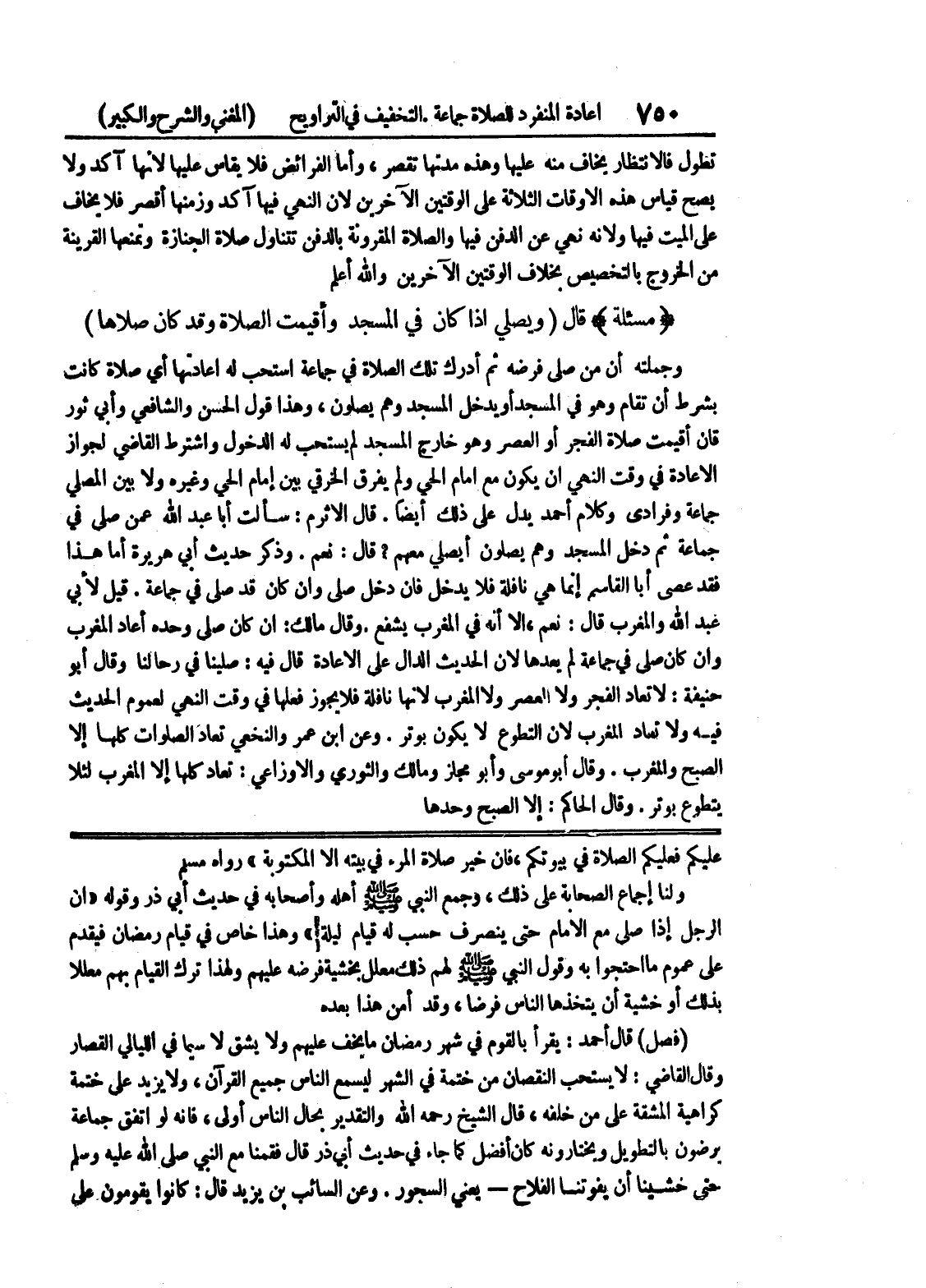 عليكم فعليكم الصلاة في بيوتكم، فإن خير صلاة المرء في بيته إلا المكتوبة " رواه مسلم ولنا إجماع الصحابة على ذلك، وجمع النبي صلى الله عليه وسلم أهله وأصحابه في حديث أبي ذر وقوله " ان الرجل اذا صلى مع الإمام حتى ينصرف حسب له قيام ليلة " وهذا خاص في قيام رمضان فيقدم على عموم ما احتجوا به وقول النبي صلى الله عليه وسلم لهم ذلك معلل بخشية فرضه عليهم ولهذا ترك القيام بهم معللا بذلك أو خشية أن يتخدها الناس فرضا، وقد أمن هذا بعده (فصل) قال أحمد: يقرأ بالقوم في شهر رمضان ما يخف عليهم ولا يشق لا سيما في الليالي القصار وقال القاضي: لا يستحب النقصان من ختمة في الشهر ليسمع الناس جميع القرآن، ولا يزيد على ختمة كراهية المشقة على من خلفه، قال الشيخ رحمه الله والتقدير بحال الناس أولى، فإنه لو اتفق جماعة يرضون بالتطويل ويختارونه كان أفضل كما جاء في حديث أبي ذر قال فقمنا مع النبي صلى الله عليه وسلم حتى خشينا أن يفوتنا الفلاح - يعني السجور.
